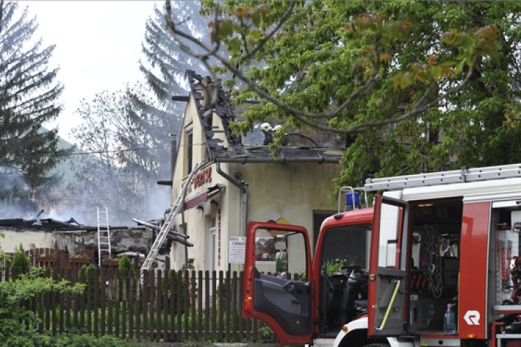 Fekete füst hömpölyög kifelé a tetőtéri ablakokon, a tűzoltók és a mentősök több járművel vonultak a helyszínre.