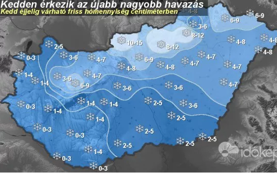Kedd éjfélig elsősorban az ország tartósan fagyos északkeleti felén gyarapodhat jelentősebben a hóréteg. A Dunántúlon a lehulló hó ismét olvadni fog, de a hőmérséklet fagypont fölé emelkedését megelőzően ott is hullhat jó pár centi, a legtöbb a Bakonyban. A déli-délnyugati szél többfelé feltámad, így helyenként hófúvásra is számítani kell.