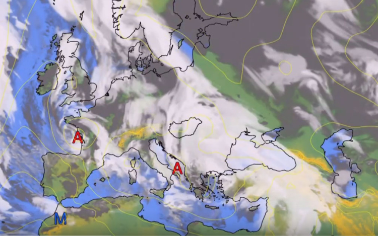 A Kárpát-medencétől délnyugatra egy mediterrán ciklon örvénylik, amelynek hatására Közép-Európában változékony az időjárás. Az Alpokban jelentős mennyiségű hó hullott, másutt több helyen 30 milliméternél is több csapadék esett. Ezzel szemben Európa legnagyobb részén Skandináviától a Fekete-tengerig anticiklon terül el. Ezeken a területeken derült és borult, ködös tájak egyaránt előfordulnak.