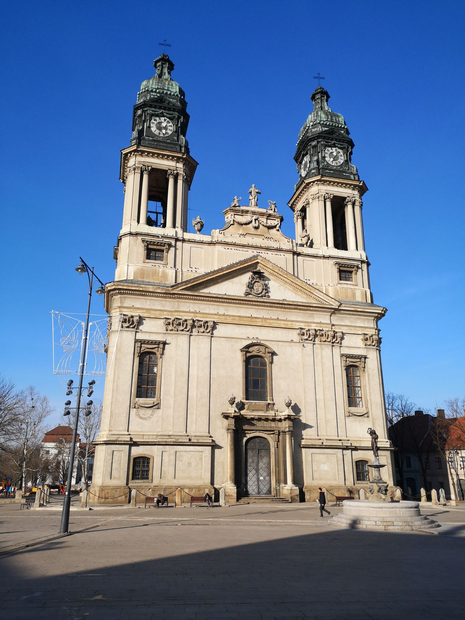 Pápa város nevezetességei közé tartozik a katolikus nagytemplom, amelyet 1774-ben gróf Eszterházy Károly egri püspök, pápai földesúr költségén kezdtek el építeni, Fellner Jakab uradalmi építész tervei alapján. Fellner halála után az építkezést Grossmann József vezette. A templom 15 év alatt épült fel. A végleges díszítések elkészülte után, 1795. május 3-án szentelte fel Pierer József püspök. A templom impozáns méretű, egyhajós ún. csarnoktemplom, amely már nem a barokk túldíszített stílusában, de annak jegyeit még magán viselve, a klasszicizmus fele hajló barokkban, copf stílusban épült meg. A templom hossza 42 méter, szélessége 22 méter, belső tere 24 méter magas, tornyának magassága 72 méter. A homlokzat hatalmas tömegét a timpanonnal, a fölötte lévő szobor-kompozícióval (3 szobor és néhány kisebb mellékszobor) és főleg a tornyok könnyedséggel megvalósuló áttört, oszlopokon álló szerkezetével oldották fel. A tornyok gyönyörű, rézborítású, összetett sisakokban végződnek. A mennyezetfreskókat Franz Anton Maulbertsch készítette, 1781–1783 között.