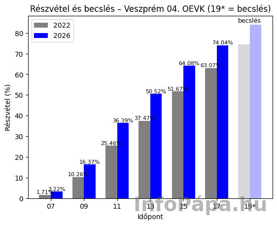 A grafikonon szereplő, 19 órára vonatkozó érték becslés, amely az eddigi részvételi trendek alapján készült. Eszerint a részvétel akár a 80 százalékot is megközelítheti a választókerületben, ami kiemelkedően magasnak számít.