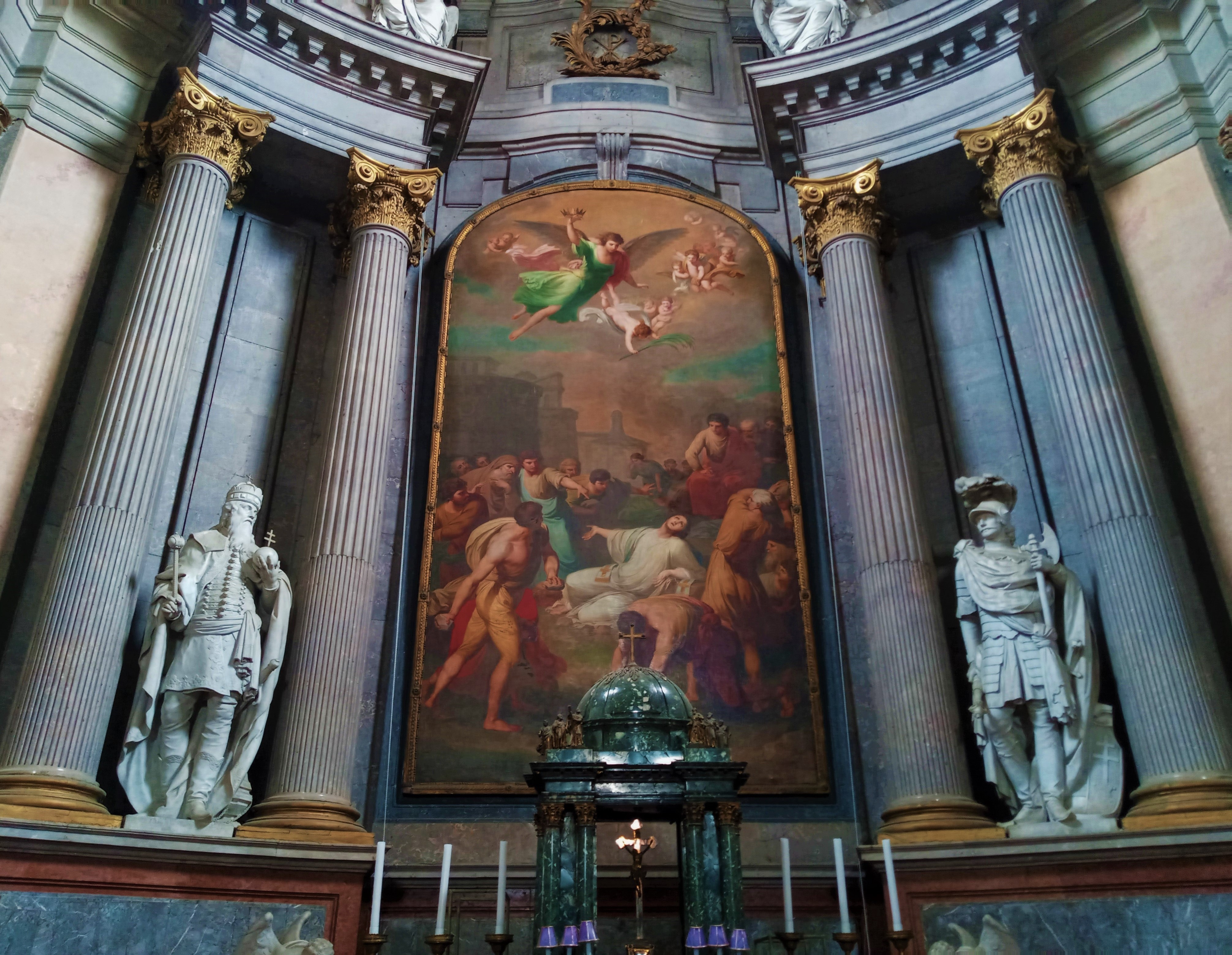 Hubert Maurer pápai főoltárfestményének gyújtópontjában a jeruzsálemi keresztény közösség első hét diakónusának egyike, a haldokló István alakja látható. Krisztus után 36-40 környékén kövezte halálra a csőcselék. Ő lett az első keresztény vértanú. A pápai Nagytemplom és Pápa város védőszentje. A festményjeleneten a jeruzsálemi falakon kívül, kivégzőinek körében látható.
