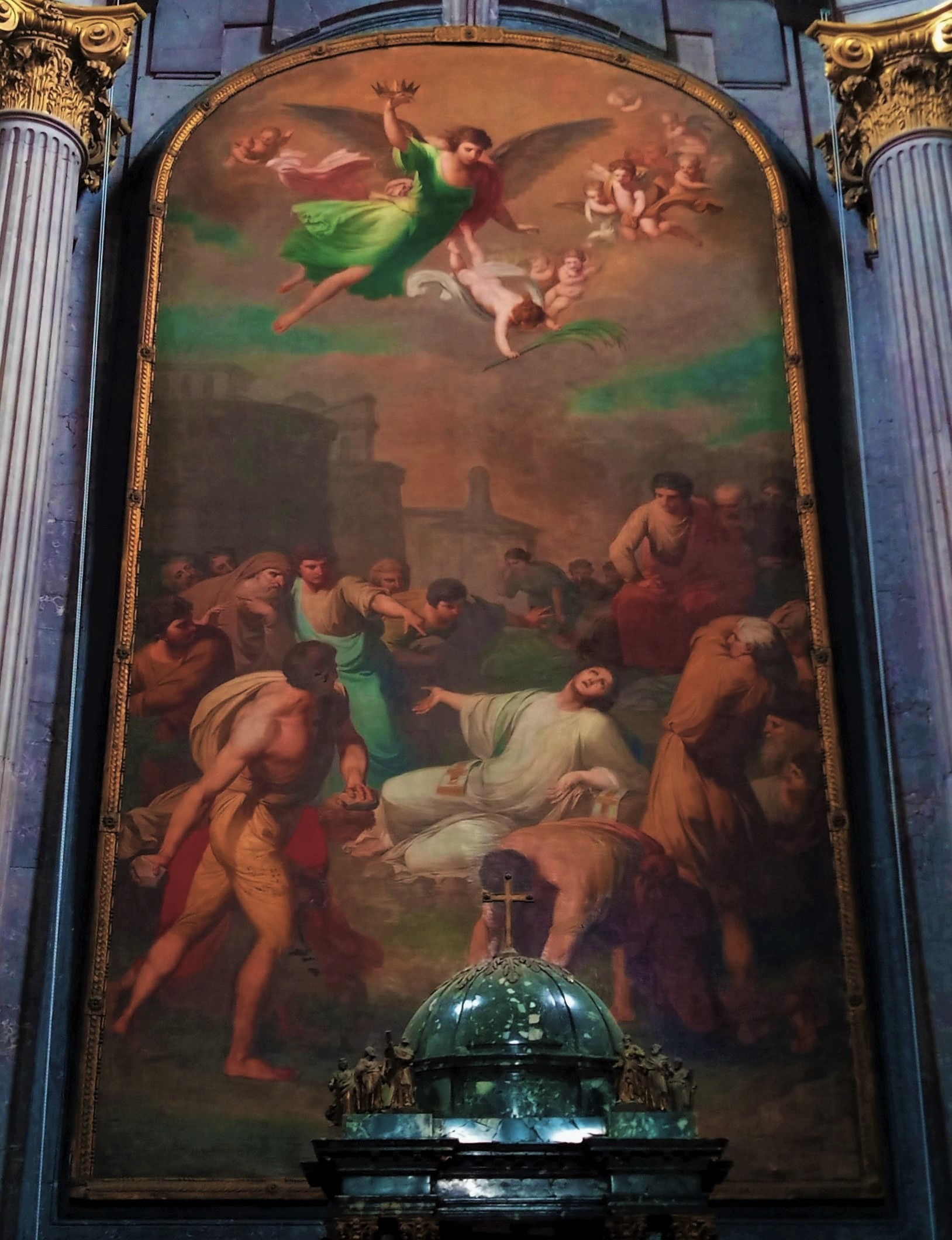 „A városfalat igazi és valódi klasszicista szabállyal festette meg Hubert Maurer: nem hiányzik az előtér, a középtér és a háttér hármas egysége. A kompozíció kimértségével a lezajló dráma, mely teátrálisan kimért, mintha kimerevedett pillanatkép volna. A protomártír álló pozíciójából térdelőn át fekvő helyzetbe »megy át«. Ez a pozíció mesterien lett kitalálva. Ez az életet a haláltól elválasztó határmezsgye. A mártír előtt ott áll a két hamis tanú is, kik elsőként vetik rá a követ. Az égből szálló angyalok már nem a barokk kor angyalkái. A koronát hozó angyal inkább görög istennőt idéz, mint a kedves mosolyú, teltkarcsú, lengő ruhás barokk megfelelője…”