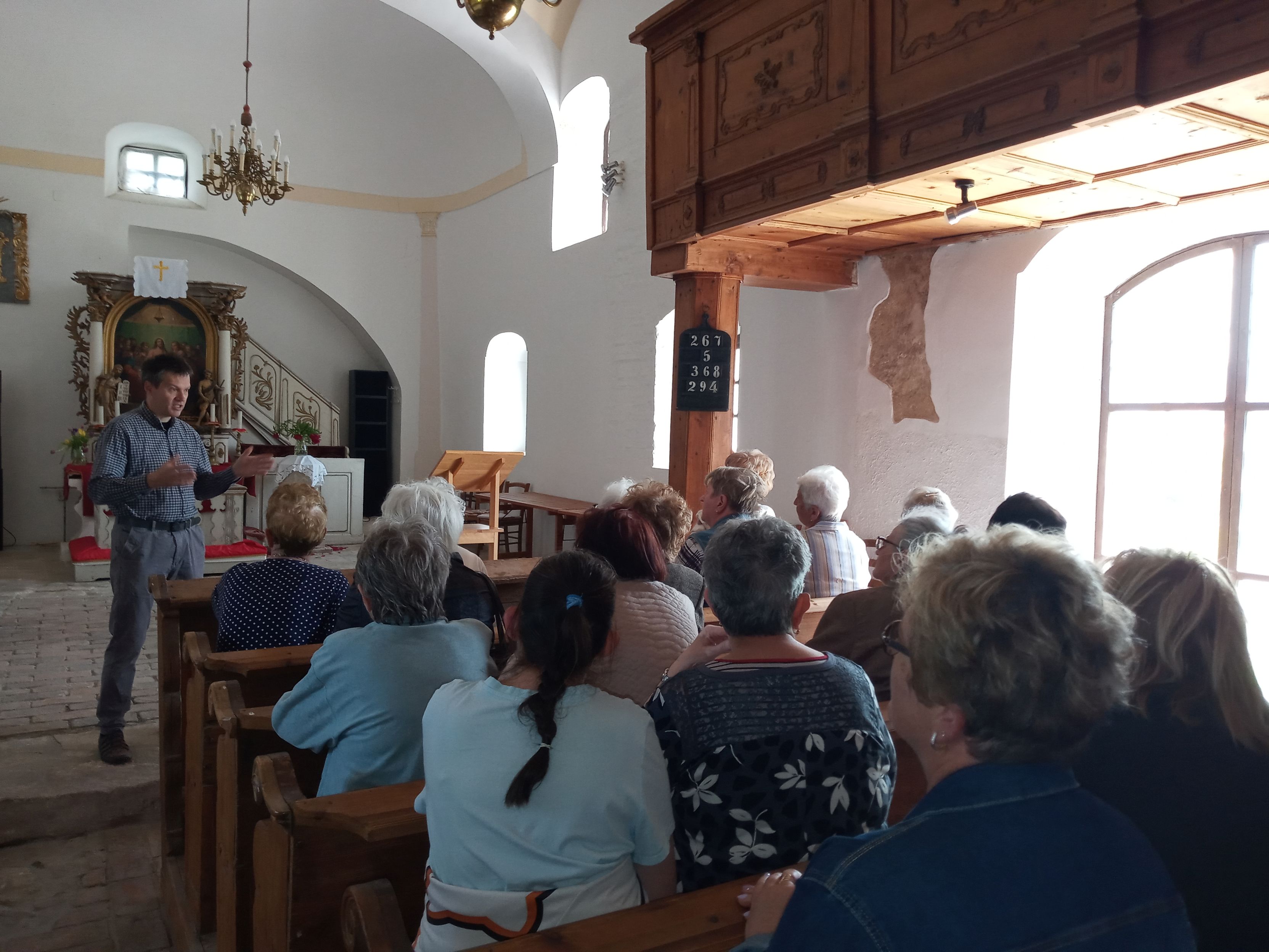 A kővágóörsi evangélikus templomba is ellátogattak, ahol Veress István lelkipásztor mutatta be számukra a Balaton-felvidék sokszínű, falusi, román kori templomépítészetének jeles emlékét. A középkori eredetű, de a 18–19. században átépített istenházában az egykori falkutatás és régészeti feltárás során megállapítást nyert, hogy a megnagyobbított templom a régi, román kori, egyenes szentélyzáródású egyház jelentős maradványait rejti magában. A 18. század végén a keleti oldalon a hajóval megegyező szélességű szentéllyel, a nyugati oldalon pedig a 19. század elején hasonló szélességű toronnyal bővítették. Így vált egyhajós, barokk teremtemplommá.