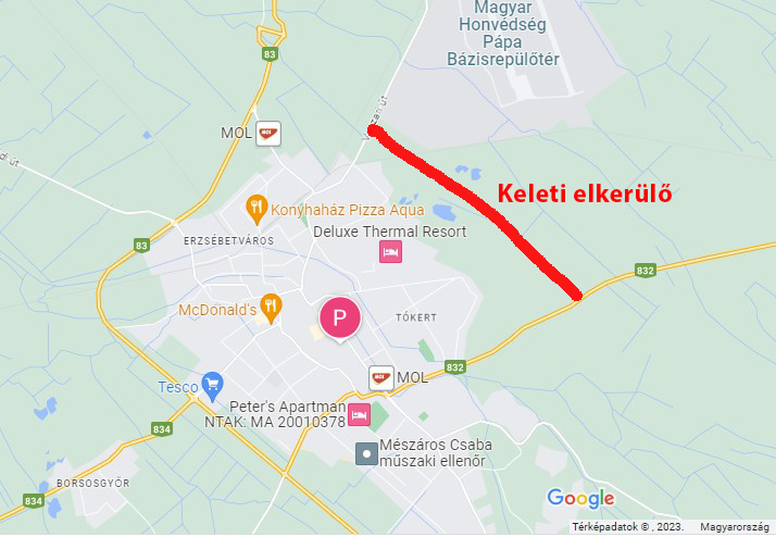 A legutóbbi Magyar Közlönyben jelent meg 24 magyarországi infrastruktúrális fejlesztés előkészítésének támogatása, köztük a Pápát keletről elkerülő út fejlesztésének az előkészítése. Egészen pontosan a Vaszari utat a Gyimóti úttal összekötő út tervezéséről van szó. A nyomvonal meghatározása az előkészítés során fog megtörténni, így csak egy általunk bejelölt elképzeléssel illusztráljuk a leendő utat.