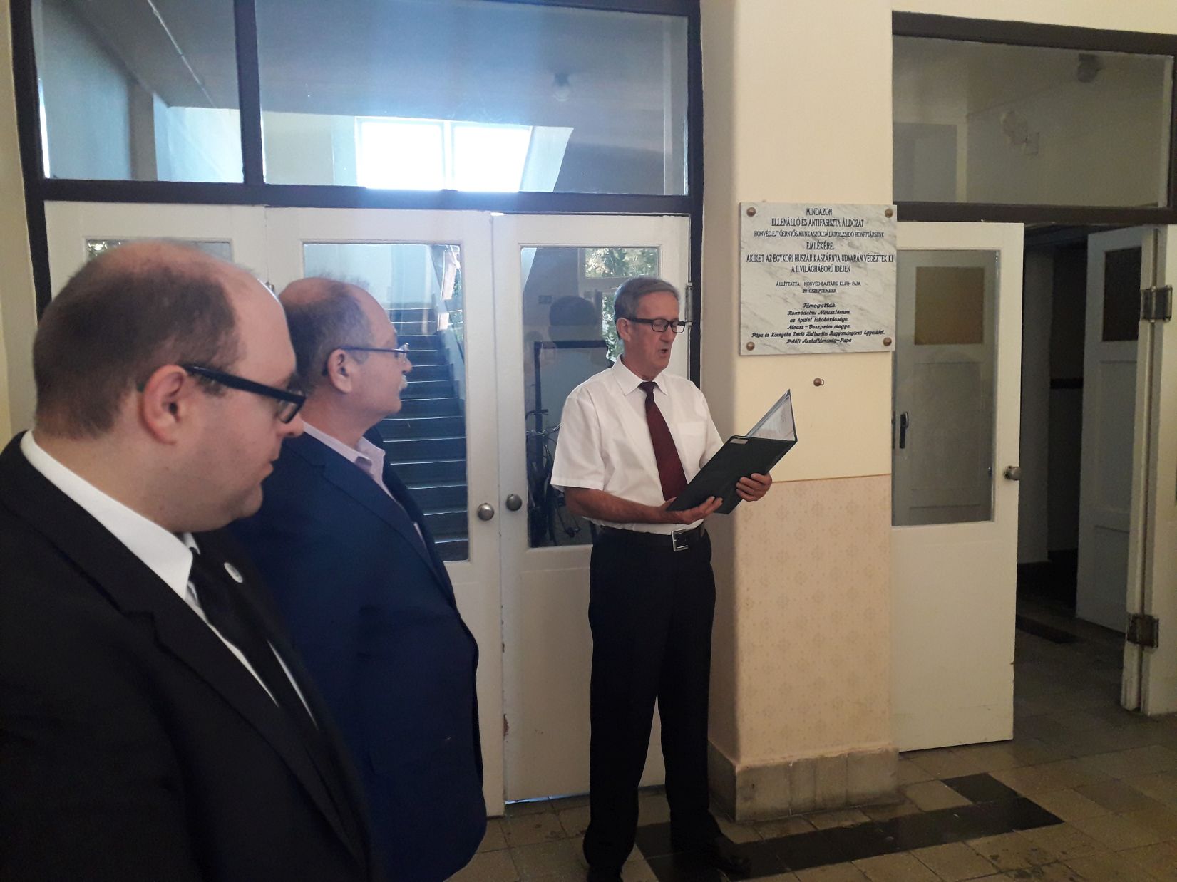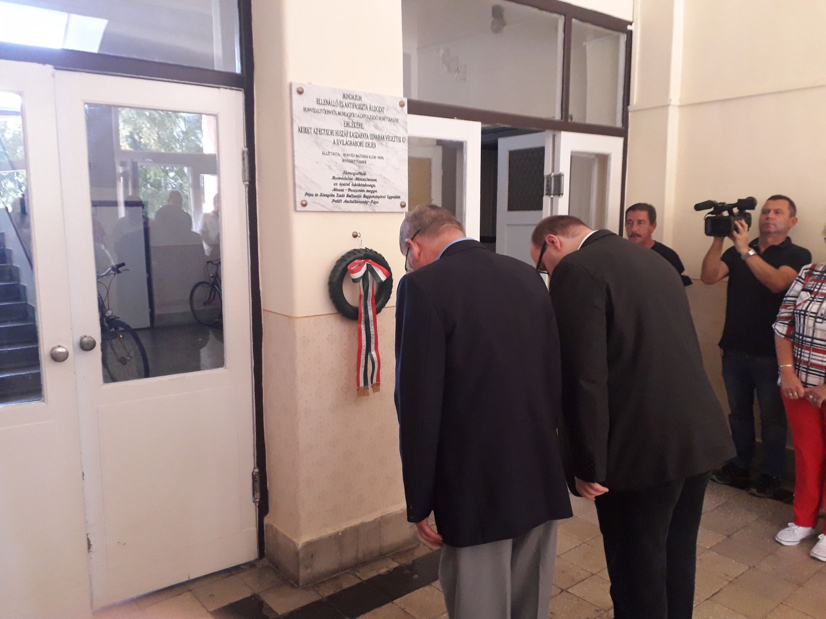 Kerecsényi Zoltán előadásának végén a Pápai Honvéd Bajtársi Klub megjelent tagjai a Huszár Közösségi Házból átvonultak a szomszédos Huszár ltp. 1/C sz. házba, amelynek földszinti előterében, az áldozatok emléktáblája előtt hajtották meg fejüket. Farkasdy Lajos nyá. őrnagy, klubelnök rövid gondolatait követve Csukárdi Tibor pápai költő, klubtag tolmácsolta Juhász Ferenc (1928–2015) Kossuth- és József Attila-díjas költő alkalomhoz illő vers-sorait, Kerecsényi Zoltán felolvasta azon ismertek neveit, akiket a lakótelep helyén, a kaszárnya udvarán öltek meg, majd Gazda József nyá. századossal, klub-alelnökkel elhelyezték az emlékezés-emlékeztetés nemzeti színű szalaggal átkötött babérkoszorúját.
