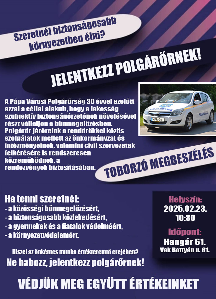 Éppen ezért találkozót kezdeményezett a Pápai Polgárőr Egyesület képviselőivel, akik fogékonyak voltak a szervezet megújítására. A lecsökkent létszámmal működő szervezetnek új tagokra van szüksége, ezért február 23-án tagtoborzó megbeszélést tartanak a Hangár 61. rendezvényközpontban, amelyre mindenkit szeretettel várnak, aki kész tenni a pápai közbiztonság helyzetének javítása érdekében. Az egyeztetésen Grőber Attila polgármester is jelen lesz.