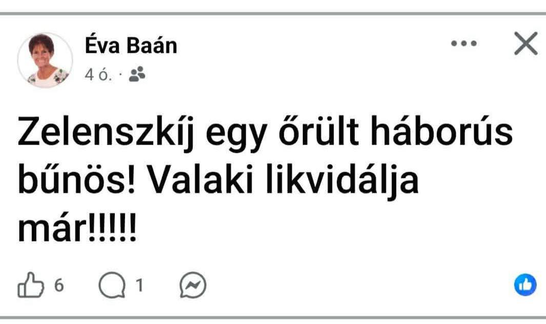 Döbbenetes képernyőkép terjed a pápai közösségi felületeken. A fotó szerint Baán Éva, a Pápai Nyugdíjasok Érdekvédelmi és Érdekképviseleti Egyesületének elnöke a következőt írta ki a Facebook falára: "Zelenszkij egy őrült háborús bűnös! Valaki likvidálja már!"