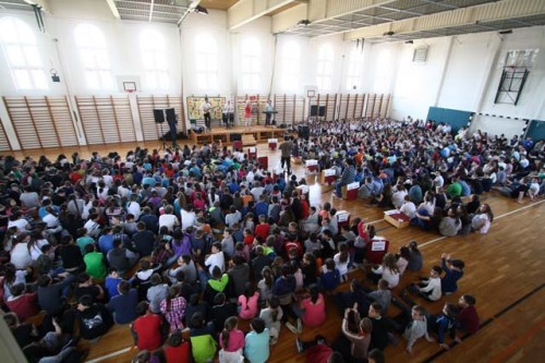 A boldogság világnapja alkalmából ezer gyerek énekelt együtt Bagdi Bellával és zenekarával az Erkel Ferenc Ének-Zenei Általános Iskola tornatermében ma délelőtt az Énekelj a boldogságért koncert keretében.