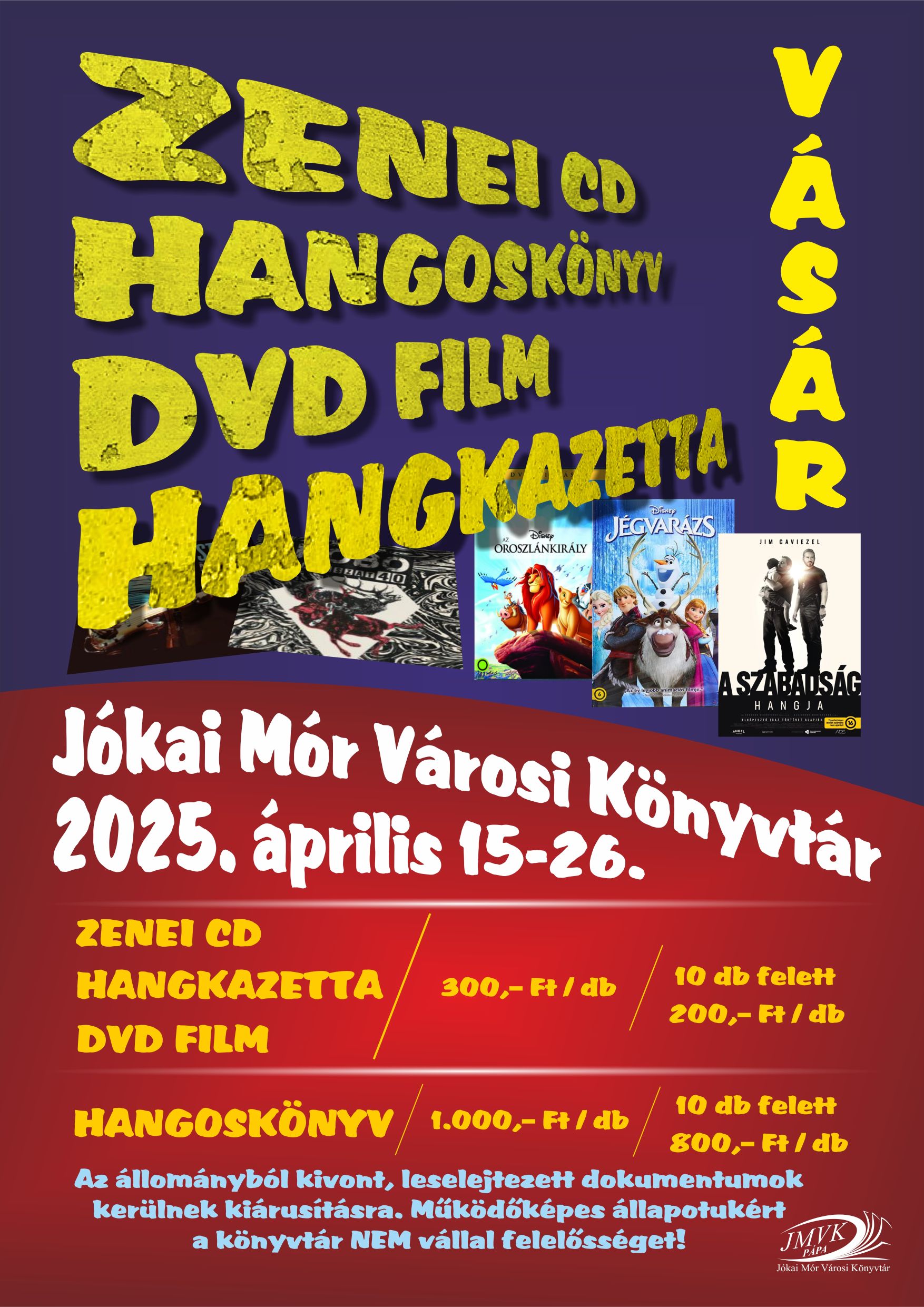 A Jókai Mór Városi Könyvtár 2025. április 15-től 26-ig (kedd-péntek: 9-18 óra, szombat: 8-16 óra) vásárt tart a leselejtezett médiatári állományából. Zenei CD, hangkazetta, DVD film 300 Ft/db (10 db felett 200 Ft/db) áron kapható. Hangoskönyveket 1000 Ft/db (10 db felett 800 Ft/db) áron lehet megvásárolni.