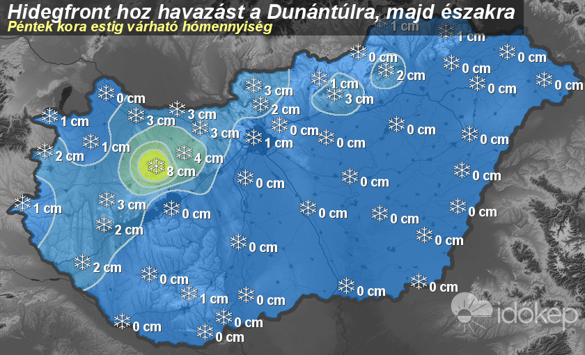 Pénteken elsősorban a Dunántúli-középhegységben, a főváros környékén és északon, északkeleten várható még havazás, keletebbre kezdetben havas eső. Délutánig elsősorban a Börzsönyen, a főváros környéki hegyekben és a Dunántúli-középhegységben alakulhat ki akár 5-10 cm vastag friss hótakaró. Szeles lesz az idő, a Dunántúlon nagy területen viharos lesz az északnyugati szél, és a hőmérséklet jelentősen visszaesik, délután mindössze 0, +6 fokot mérhetünk.