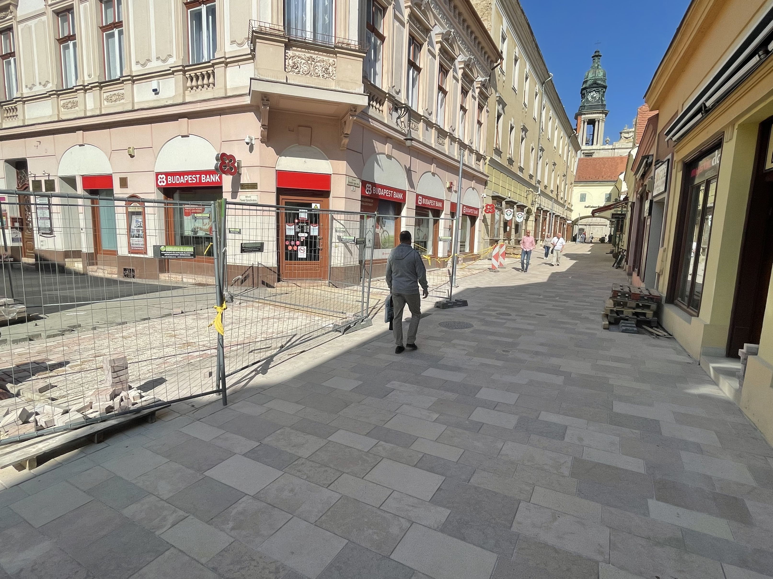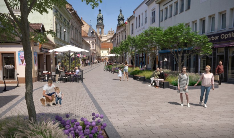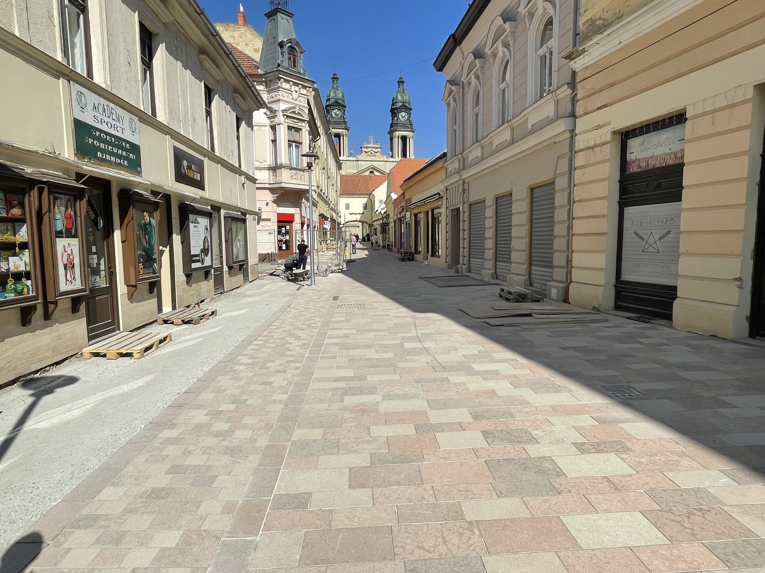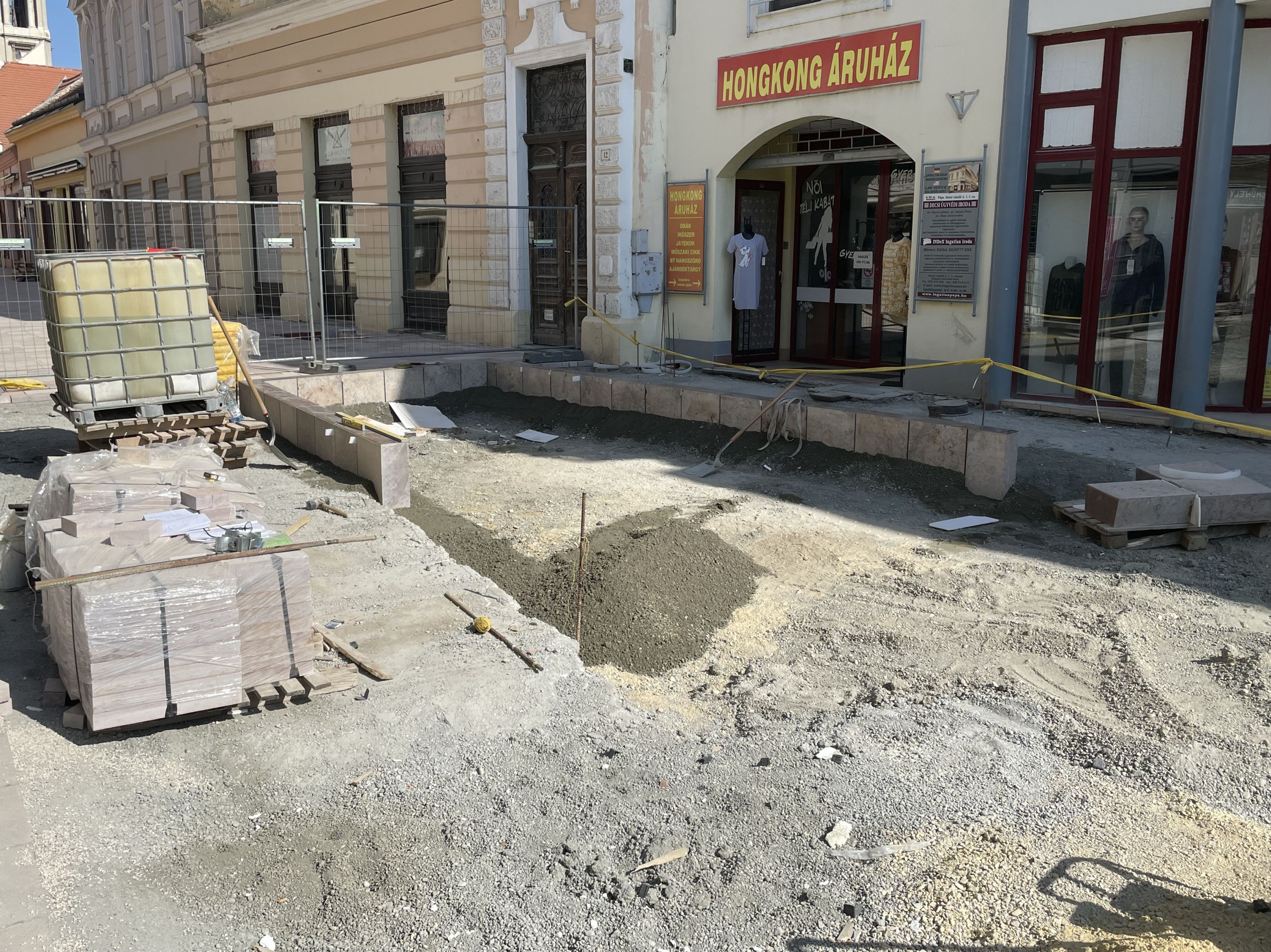 A végéhez közeledik a Kossuth utca első szakaszának burkolása, a több mint 130 méteres szakasz mindegy 80-90 százalékán már elkészült a térkövezés. Az áruház felől azonban egy szélesebb teresedés található, itt némileg lelassul a munka, ugyanis ezen a ponton alakítják ki az első zöld szigetet. Méretes kőtömbökkel szegélyezik a mintegy 80 négyzetméteres felületet, ahol bokrok, fák és öntözőrendszer kap helyet, a tervek szerint április közepén, az első szakasz kivitelézésének végén.