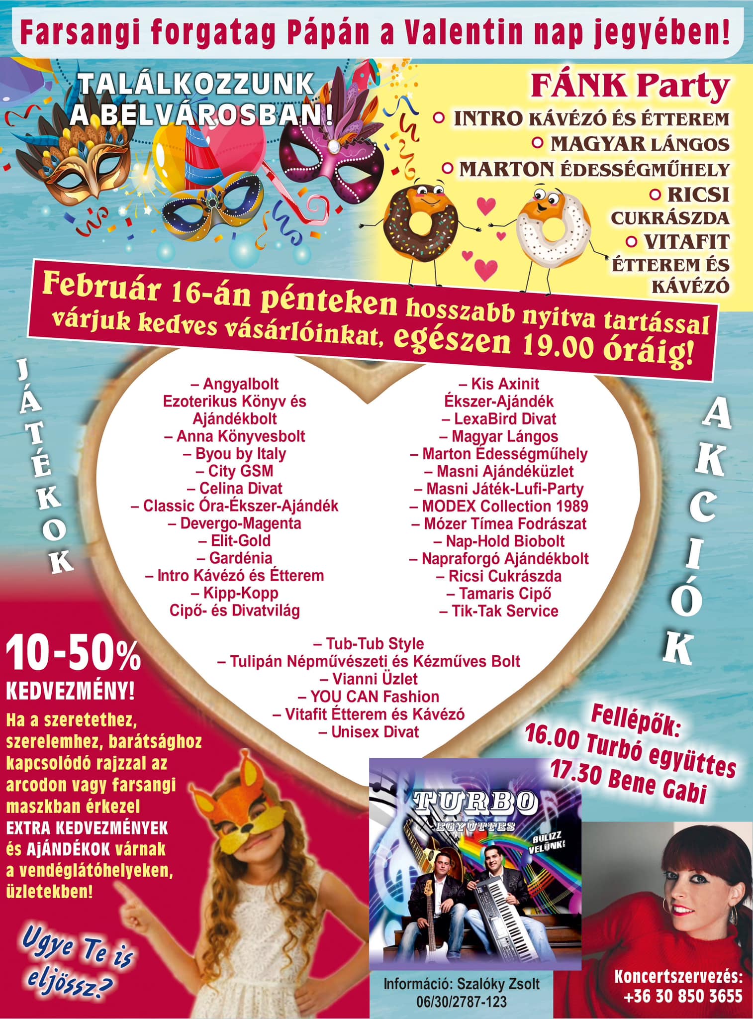 Cél a vásárlók visszacsábítása a belvárosba, ezért programokkal, meglepetésekkel, hosszabb nyitva tartással várnak mindenkit az üzletek, minden hónap harmadik péntekjén. Ezúttal a farsang jegyében szerveződik a pénteki alkalom, délután 4 órától a Turbó Együttes zenél, majd pedig 17:30-tól Bene Gabi szórakoztatja a közönséget. A fellépők csatlakoztak az összefogáshoz, teljesen ingyen vállalták a fellépést, hiszen maguk is támogatják a kitűzött célt, vagyis egy nyüzsgő, élettel teli belvárosi környezet visszaállítását.