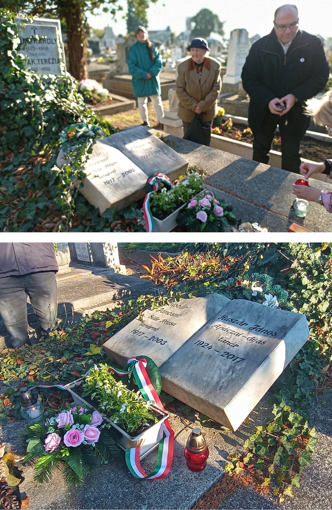 A megjelentek koszorút vittek és mécsest gyújtottak a 2017-ben, kilencvenhárom esztendős korában elhunyt Huszár János Apáczai-díjas történelemtanár, Bél Mátyás-díjas helytörténész sírjához is. Kerecsényi Zoltán elmondta: Huszár tanár úrra, János bácsira nem lehet elfogultság nélkül gondolni, emlékezni. Azt hiszem, mindnyájunknak, akik most itt összegyűltünk, sok-sok személyes emléke van János bácsiról. Az én személyes életemet is meghatározóan végigkísérte személyisége és végigkíséri emléke. Huszár János életével, munkásságával teljesebbé váltunk mi, pápaiak, s szélesedjék az elkövetkezendő pápaiak látószöge is, legyen szebb, teljesebb az eljövendő Pápa is néhai Huszár János tanár úr, a nagybetűs HELYTÖRTÉNÉSZ üzenet-művei és emlékezete által. Egyletünk két esztendővel ezelőtt egy szerény kis emlékjelet állított János bácsi életének egykori meghatározó helyszínén, a Zimmermann utca 10. szám alatt, a hajdani pápai Római Katolikus Polgári Fiúiskola és a II. sz. Általános Iskola épületében, a jelenlegi pápai Szent Anna Római Katolikus Óvoda belső bejáratánál. Szeretnénk, ha 2024 nyarára, a kerek 100. születési évfordulóra ott egy komolyabb, méltóbb állhatna majd János bácsi emlékét hirdetve.