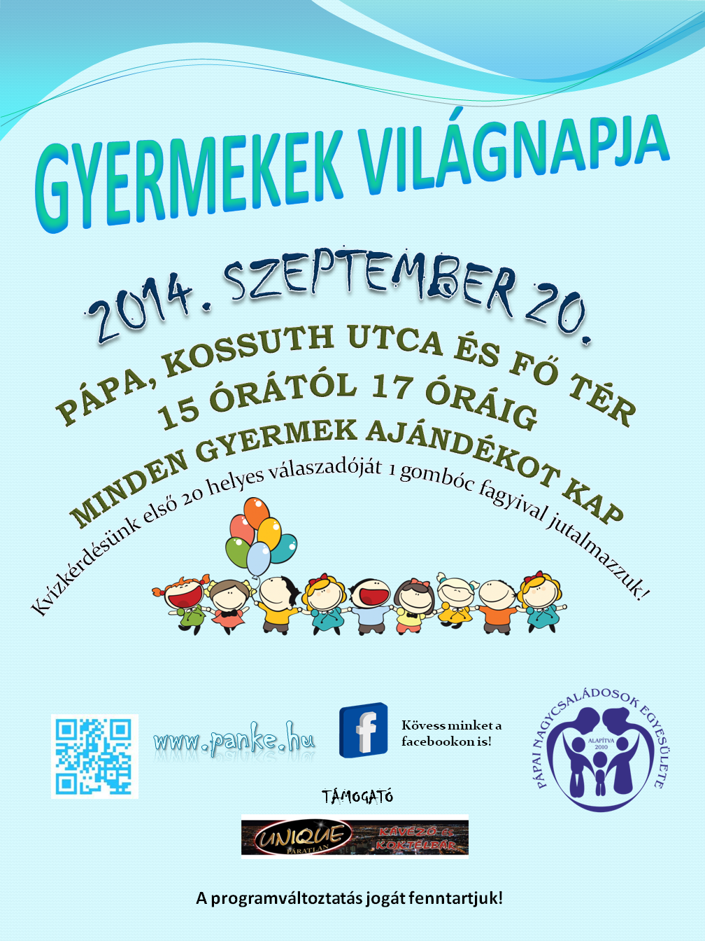 2014. szeptember 20-án, Pápán immár 4. alkalommal kerül sor a PÁNKE által szervezett figyelemfelhívó akcióra a Gyermekek Világnapja alkalmából. Az Egyesület fontosnak tartja hangsúlyozni, hogy az ENSZ által megfogalmazott jogokat biztosítani, megvalósulásukat számon kérni és betartatni minden szülő alapvető kötelessége. Ilyen, a gyermekeket megillető jog többek között a névhez, állampolgársághoz, oktatáshoz, egészséghez való jog.