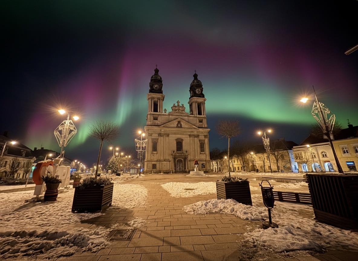 Gyönyörű a sarki fénnyel díszített pápai Fő tér!