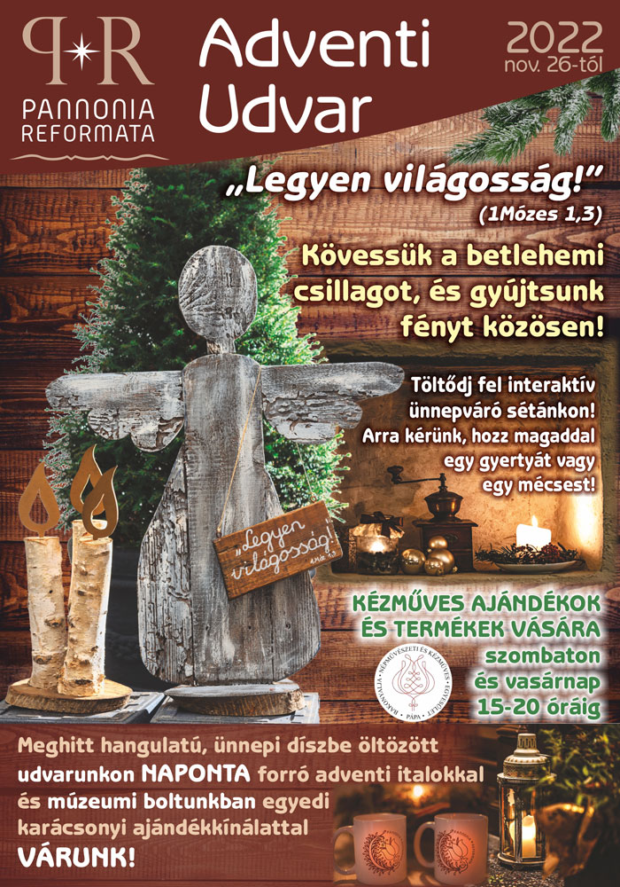 A Pannonia Reformata Múzeum vezetője hozzátette, ezenkívül a kávézóban naponta forró téli italokkal, a múzeumi ajándékboltban adventi termékekkel várják a látogatókat. Minden adventi hétvégén, szombaton és vasárnap 15-20 óráig kézműves ajándékok és termékek vására is lesz a hangulatos udvarban.