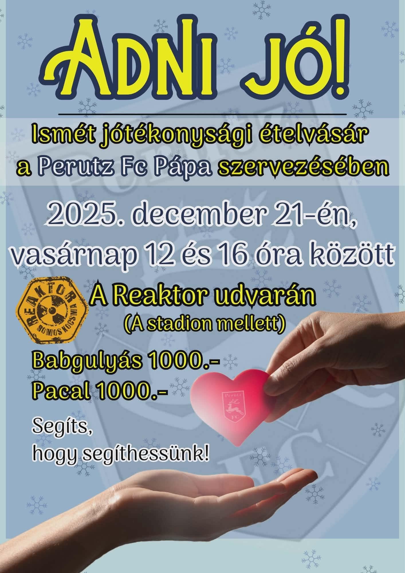 A Pápai Perutz FC számára mindig fontos volt, hogy ne csak a sportpályán, hanem a közösségünkben is példát mutasson. Ezért idén is megrendezik hagyományos karácsonyi jótékonysági ételosztásukat, melynek bevételét a Sérült Gyermekek Egészséges Neveléséért Alapítvány kapja - írja közösségi oldalán a Perutz FC.