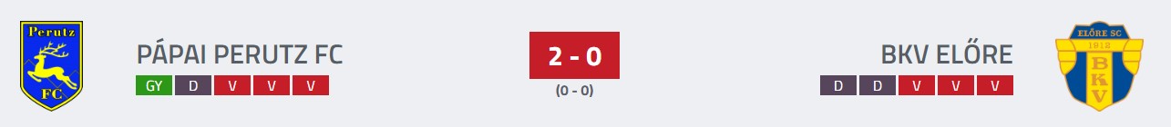 A nem túl eseménydús első játékrészt követően magasabb sebességfokozatra kapcsolt a Perutz, amelynek a 61. percben meg is lett az eredménye, Szabó Zsolt révén megszerezte a vezetést a Pápa. Ennek tudatában sem állt vissza védekezni a hazai csapat, továbbra is nyomás alatt tartotta a vendégeket, helyzeteket alakított ki, majd ismét betalált. Egy kapu előtti kavarodás után Dóczi Krisztián duplázta meg az előnyt. A folytatásban adódtak helyzetek itt is, ott is, de igazi veszélyt egyik csapat sem jelentett a másikra. Két gólos sikerével megszerezte a Perutz FC idei második győzelmét.