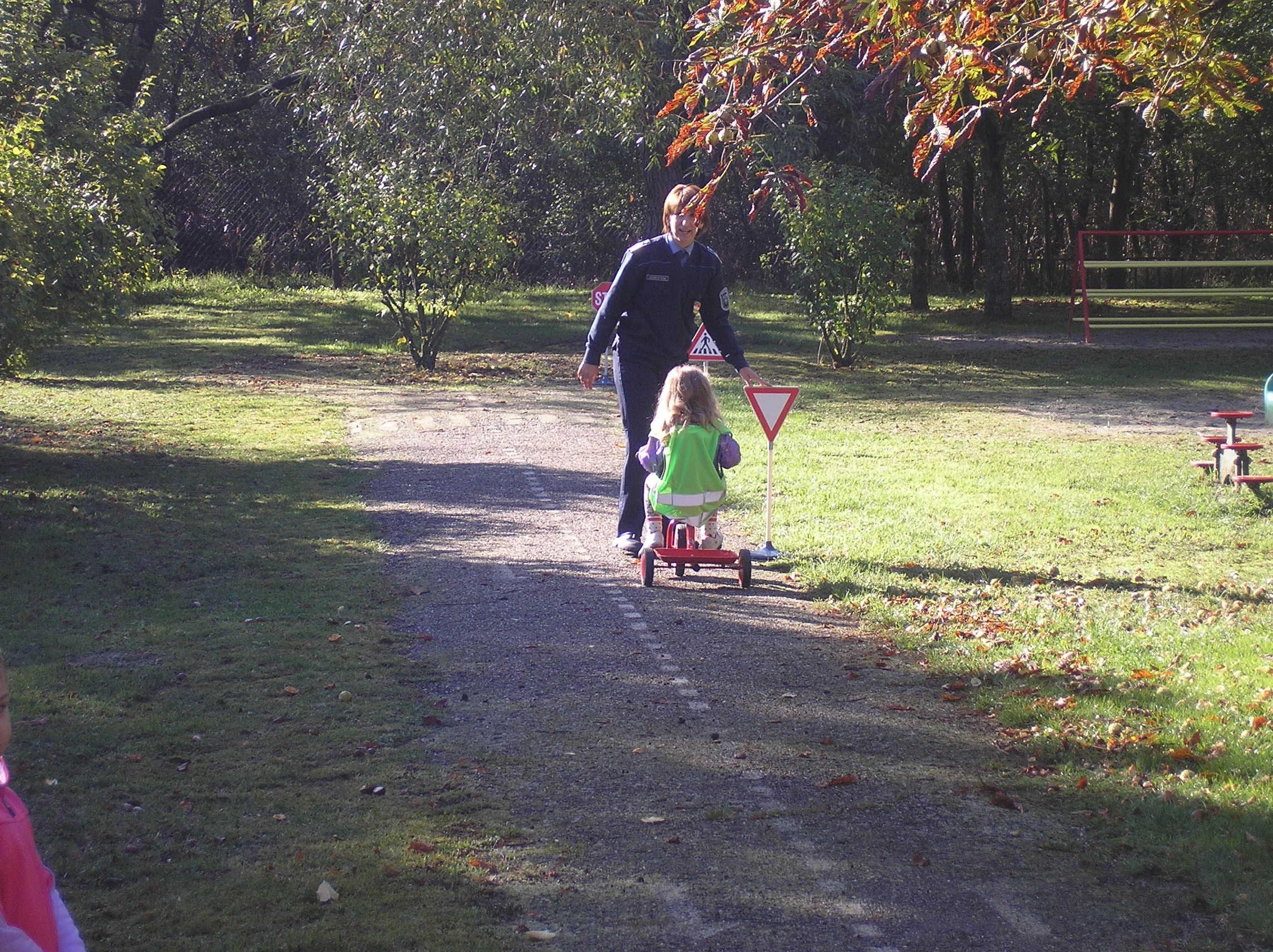 A Pápai Rendőrkapitányság munkatársai – az óvodapedagógusok felkérésére – 2017. október 4-én délelőtt a Négyszögletű-Kerekerdő Óvoda és Családi Napközi kemenesszentpéteri tagóvodájában tartottak közlekedési foglalkozást, ahova a kemeneshőgyészi óvodások is meghívást kaptak. A gyermekek először egy beszélgetés keretében ismételték át az úttesten történő átkelés szabályait, majd megismerkedtek a kerékpár kötelező tartozékaival. Ezt követően az udvaron levő aszfaltos mini utat vették birtokba, ahol láthatósági mellényben gyakorolták a szabályos kerékpározást. Megtanulták, hogy a gyalogos-átkelőhelynél a gyalogosoknak mindig elsőbbséget kell adni, valamint megismerkedtek az elsőbbségadás táblával is, ami előtt mindenki alaposan körülnézett.