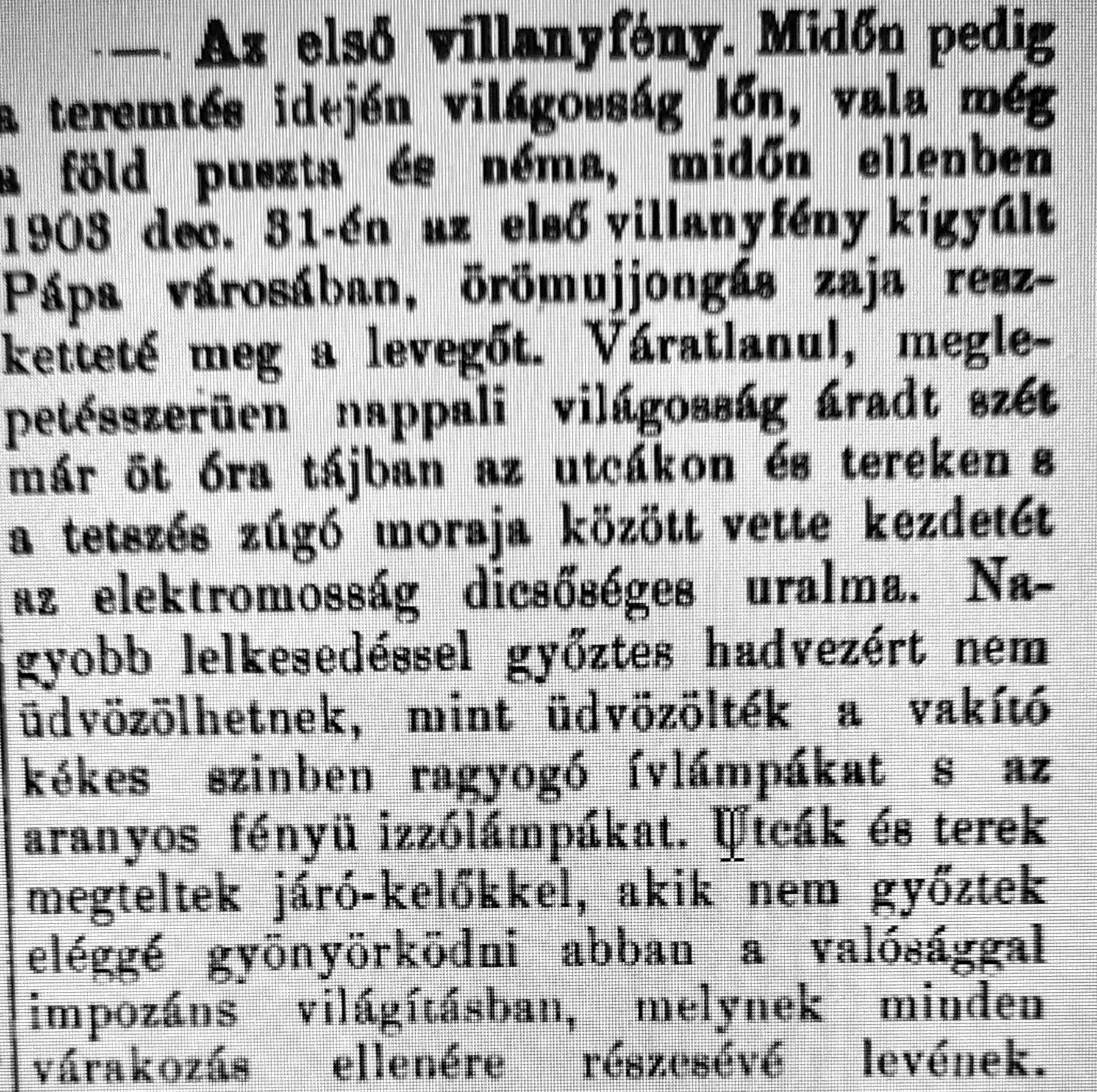 - Az első villanyfény. Midőn pedig a teremtés idején világosság lőn, vala még föld puszta és néma, midőn ellenben 1903 december 31-én az első villanyfény kigyúlt Pápa városában, örömujjonság zaja reszketteté meg a levegőt.Váratlanul, meglepetésszerűen nappali világosság áradt szét már öt óra tájban az utcákon és tereken, s a tetszés zúgó moraja között vette kezdetét az elektromosság dicsőséges uralma. Nagyobb lelkesedéssel győztes hadvezért nem üdvözölhetnek, mint üdvözölték a vakító kékes színeben ragyogó ívlámpákat, s az aranyos fényű izzólámpákat. Utcák és terek megteltek járó-kelőkkel, akik nem győztek eléggé gyönyörködni abban a valósággal impozáns világításban, melynek minden várakozás ellenére részévévé levének - írta az 1903-as pápai újság hasábja, a nagy jelentéséggel bíró eseményről.