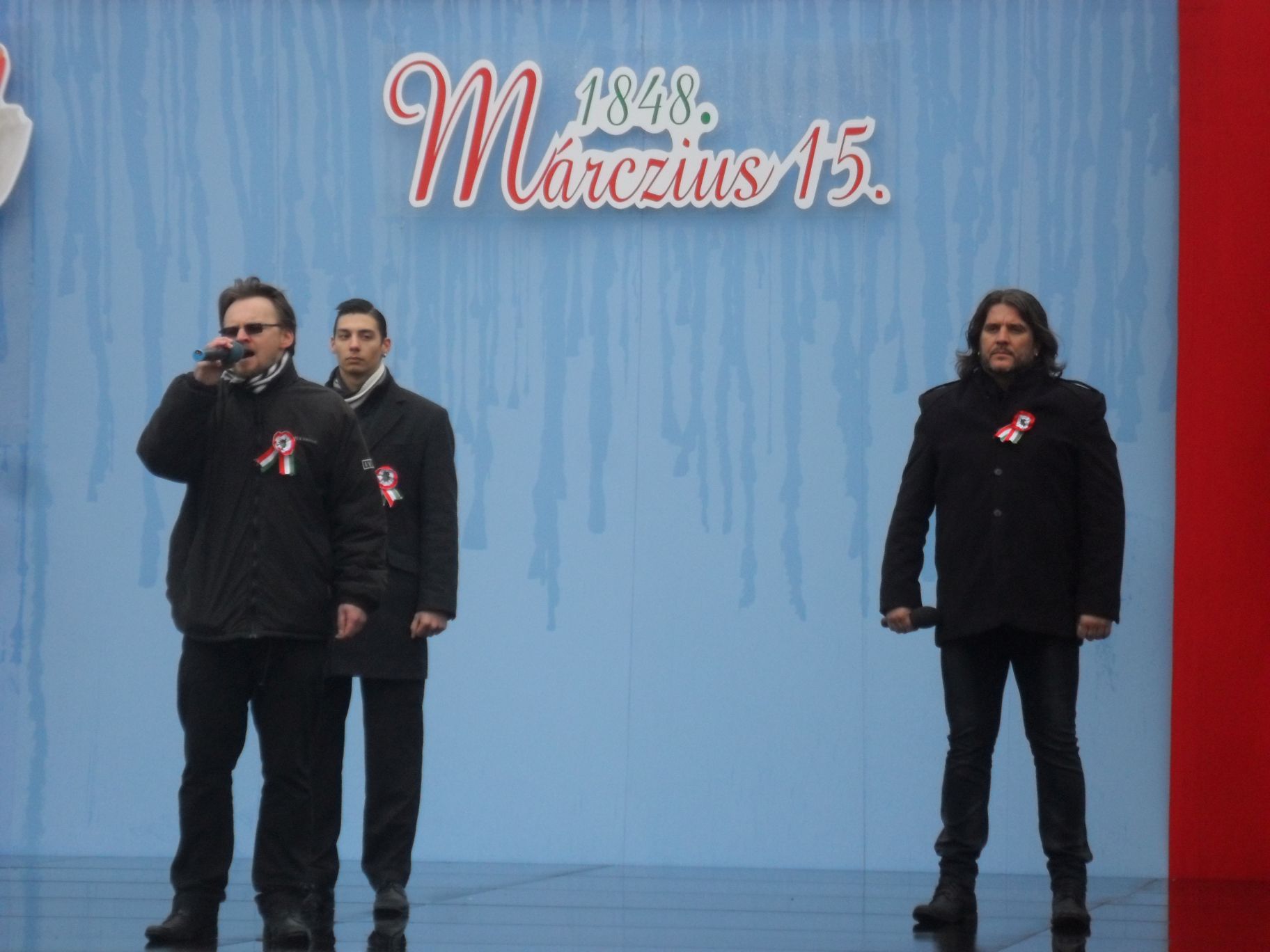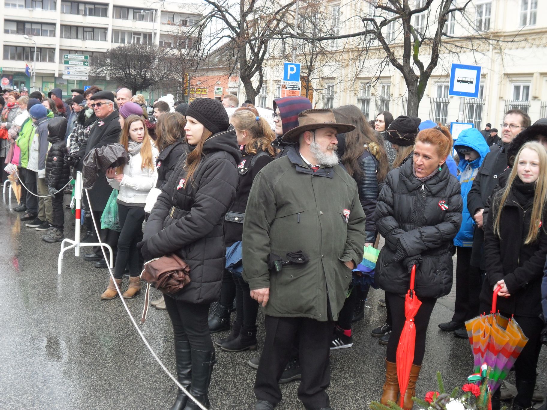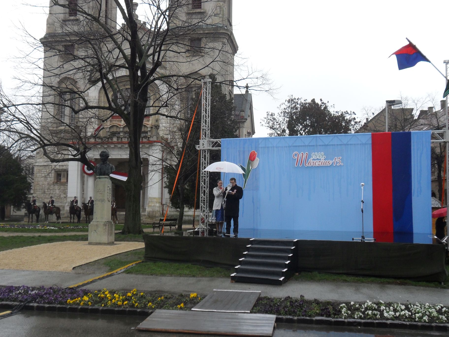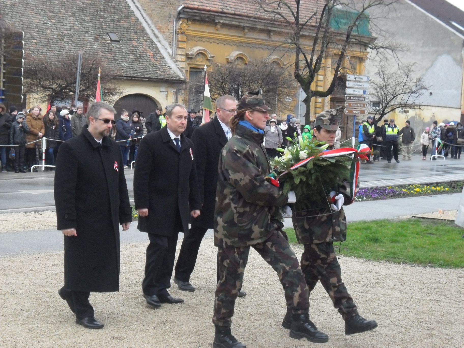 Az időjárás nem volt kegyes az ünnepelni vágyókhoz. A szitáló havas eső ellenére szép számú tömeg gyűlt össze a Március 15. téren. A Himnusz eléneklését követően Nagy L. István köszöntötte az egybegyűlteket. A Gróf Esterházy Károly Múzeum igazgatója a magyar történelem egyik leggyönyörűbb, legmagasztosabb napjának nevezte március 15-ét. Történészként áttekintette e szimbólummal vált nap és annak előzményeinek valódi történetét. Mint mondta, csalóka az az általánosságban kialakult kép, mely szerint az 1848-as forradalmat a március 15-i pesti eseményekkel azonosítjuk, mivel a valódi forradalom nem Pesten, hanem Bécsben és Pozsonyban zajlott. – Pozsonyban az utolsó magyar rendi országgyűlés fogalmazta meg követeléseit az ország átalakítására, a feudális jogrend felszámolására, a polgári berendezkedés kialakítására és nemzeti önrendelkezésre. Ezeket a követeléseket Bécsben az uralkodó jóváhagyta, ezzel pedig megkezdődött a polgári átalakulás jogi kereteinek kialakulása, a nemzet kezébe vette saját sorsát. Ezzel együtt nem szabad lebecsülnünk a pesti eseményeket, ugyanis közvetett módon komoly hatást gyakoroltak az eseményekre – fogalmazott a történész.