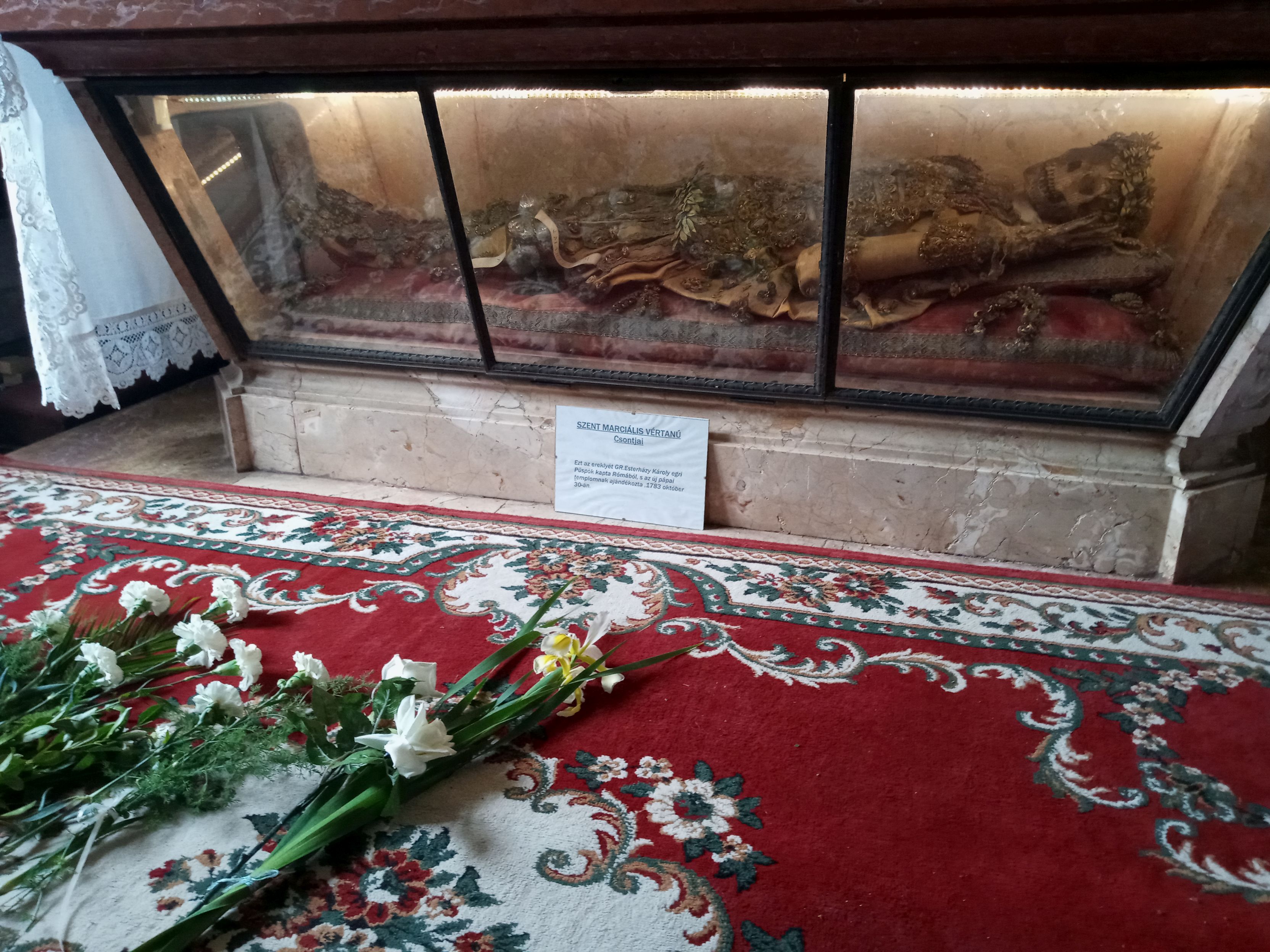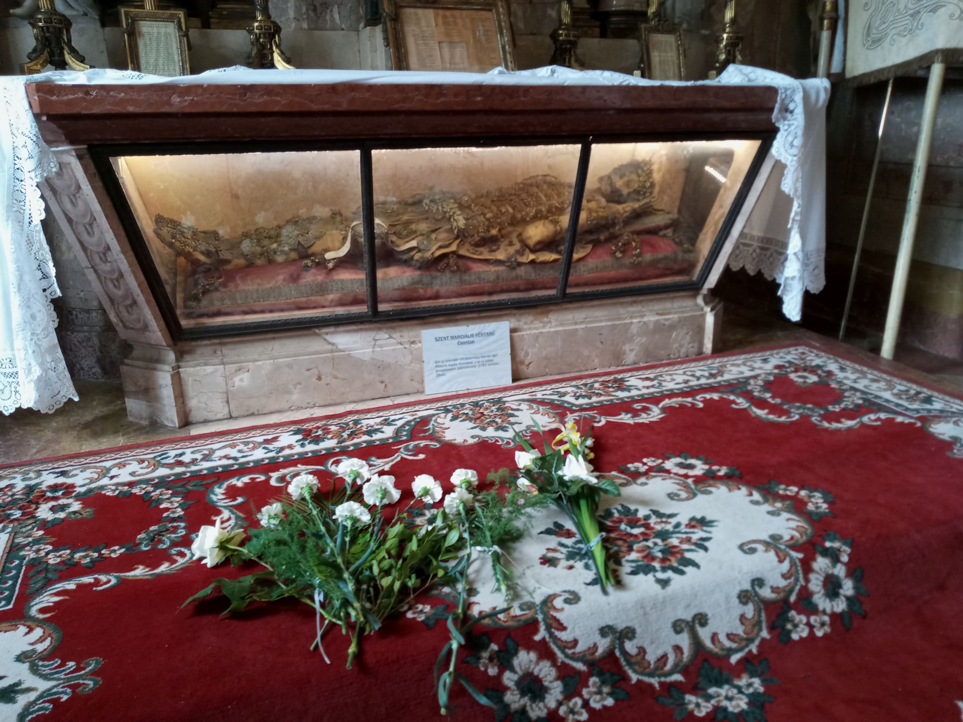 A drágakövekkel – számtalan mennyiségű igazgyönggyel – ékesített, illetve arannyal hímzett barokkos-magyaros, sujtásos díszruhába öltöztetett Szent Martialis római légionárius vértanú idén immár 240 éve, hogy Pápa városában, egy üvegkoporsóban nyugszik.