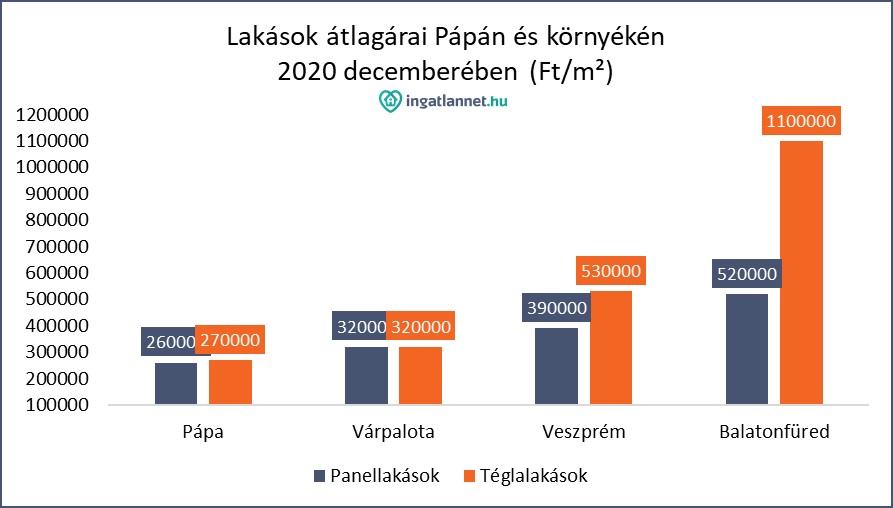 A lakáspiacra áttérve a vizsgált városok közül szintén Pápán jártak a legjobban az ingatlanvásárlók. A pápai panelek 2020-as átlagára 260 ezer Ft/m², a téglalakásoké 270 ezer Ft/m² volt. Várpalota ezúttal sem sokkal előzte meg Pápát, lakáspiaci átlagárai 50-60 ezer forinttal mutatkoztak magasabbnak négyzetméterenként.