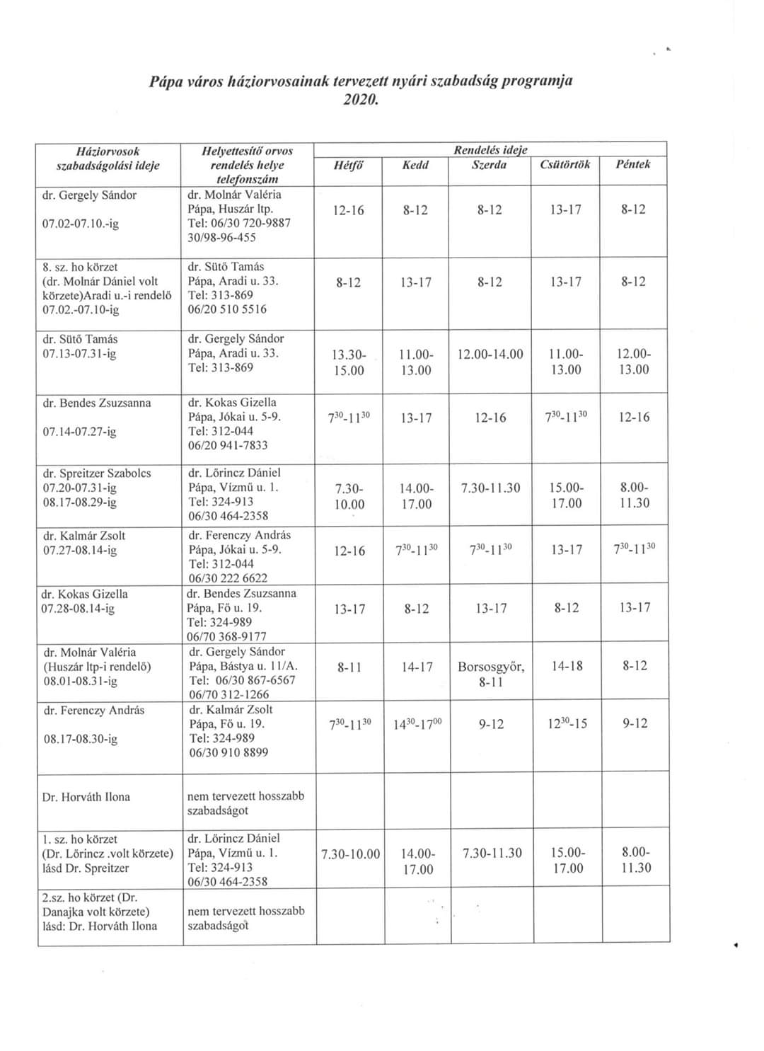 Pápai háziorvosok tervezett szabadsága 2020-ban