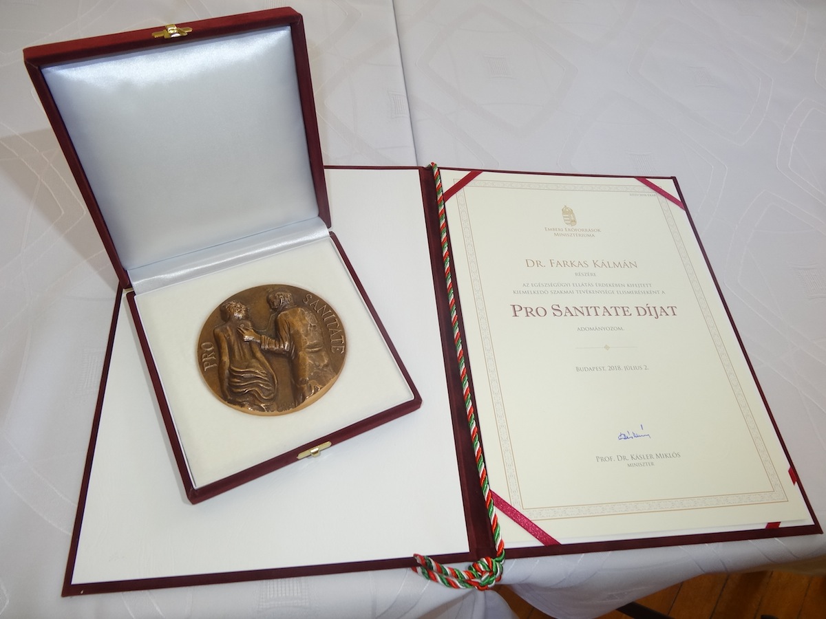 Dr. Farkas Kálmán dr. Kásler Miklós minisztertől és dr. Nagy Anikó államtitkártól vehette át a rangos elismerést, a Vigadó épületében tartott központi Semmelweis-napi ünnepségen.