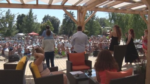 A hétvége utolsó napján a vendéglétszám megdöntötte az idei rekordot, már kora délutánig több mint négyezren látogattak el a fürdőbe, estére pedig a vendéglétszám megközelítette a négyezer-hétszázat. A strandolókat a Pápai Musical Stúdió szórakoztatta, az énekesek igazi nyári, vidám dalokat énekeltek, a vendégek pedig az élménymedencében és a medence partján együtt dúdoltak a fellépőkkel. A győri Nagy Péternek és családjának nagyon tetszett a program. Mint megtudtuk, gyakran járnak Pápára fürödni, a sokféle medence és csúszda miatt, amit gyermekei nagyon szeretnek.