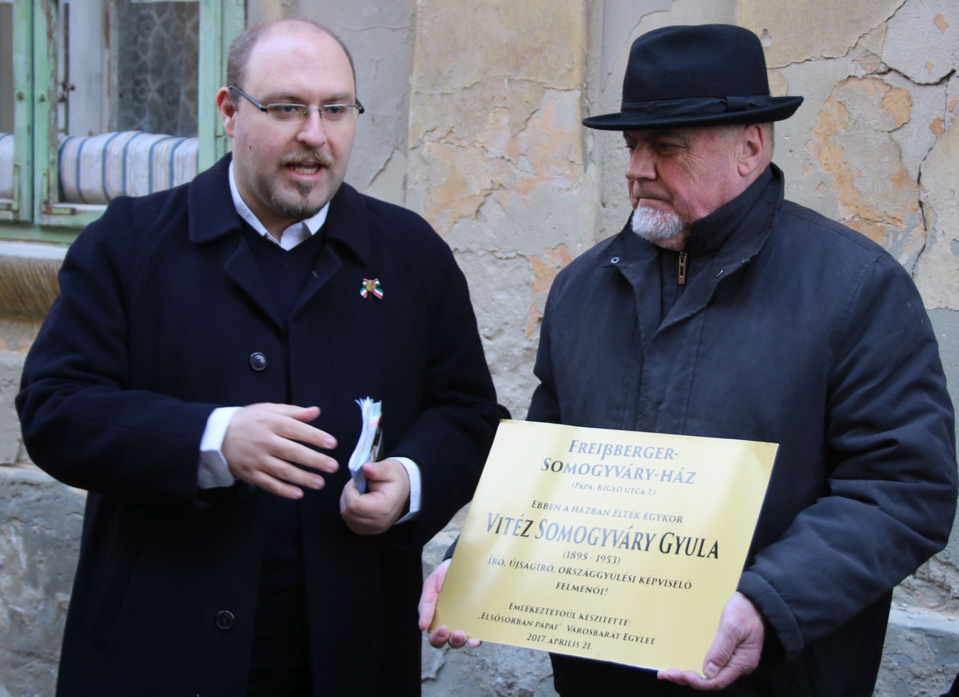 Ma hoztunk ide egy kis szimbolikus emlékjelet. Egy kis fém emléktáblácskát készítettünk (hasonlót mint tavaly a tókerti fiókkönyvtárra is), amelyet jelképesen most leleplezünk Somogyváry emlékére. Tudjuk, hogy a szigorú műemlékvédelmi szabályok nem teszik most lehetővé, hogy felhelyezzük, ezért megőrzésre átadjuk majd az itt lakóknak. Jövőre lesz 65. évfordulója Somogyváry elhunytának. De jó lenne, ha egy esztendő múlva már pozitív dolgokról számolhatnánk be itt állva. Valahogy csak meglehetne menteni ezt az értékes pápai házacskát, amelyet valóban meg tudnánk jelölni egy emléktáblával néhai Freißberger-Somogyváry polgártársaink emlékére, - az utókor számára...
