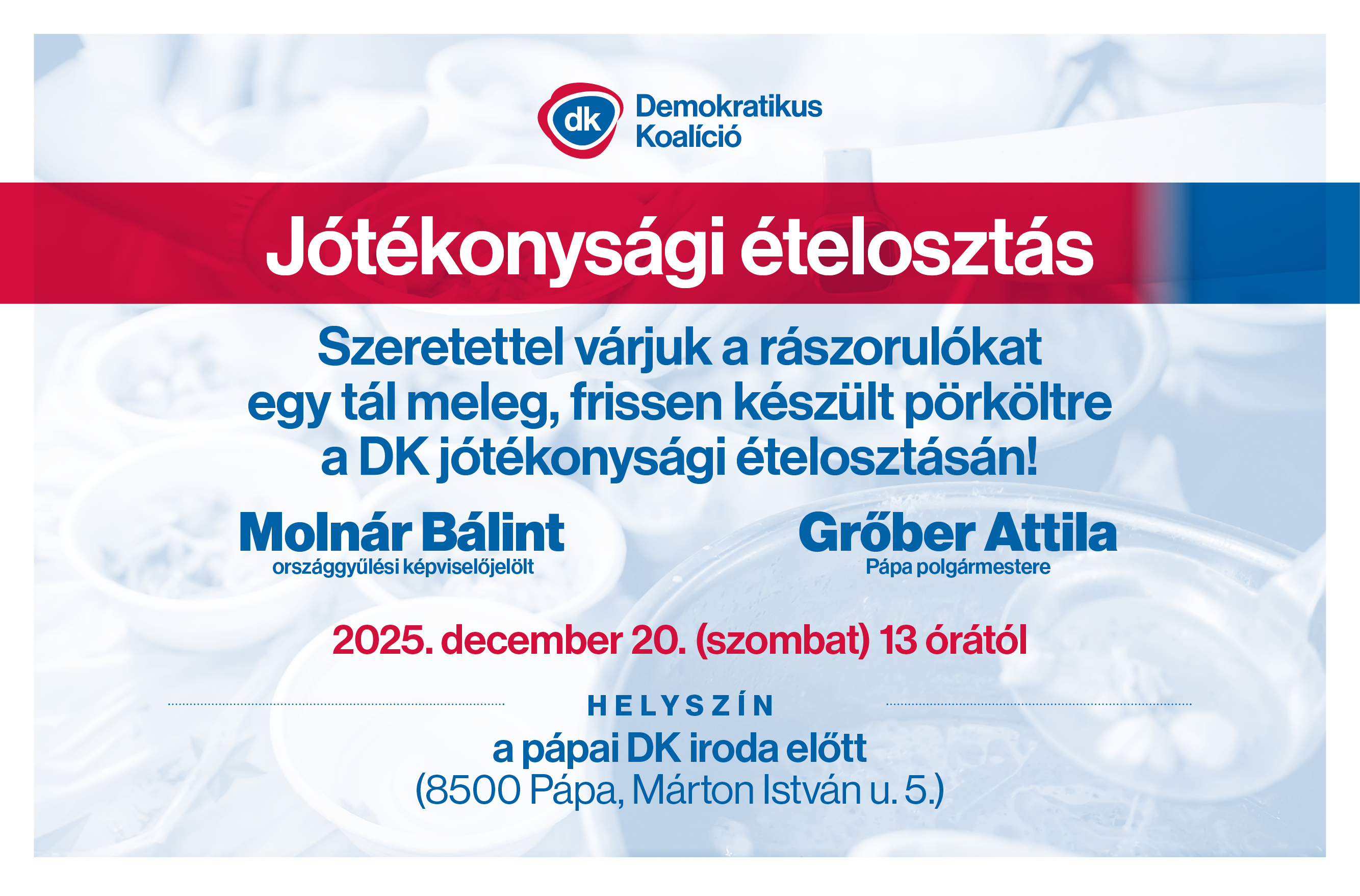 - 2025. december 20-án (szombaton) 13 órától egy tál meleg étellel várjuk mindazokat, akik számára az ünnepek sajnos nem az örömről, hanem a mindennapi túlélésről szólnak. Az ételosztásra a Demokratikus Koalíció pápai irodája előtt kerül sor (Pápa, Márton István utca 5.), ahol közel 100 adag pörkölttel készülünk a rászorulók számára - mondta el Molnár Bálint.