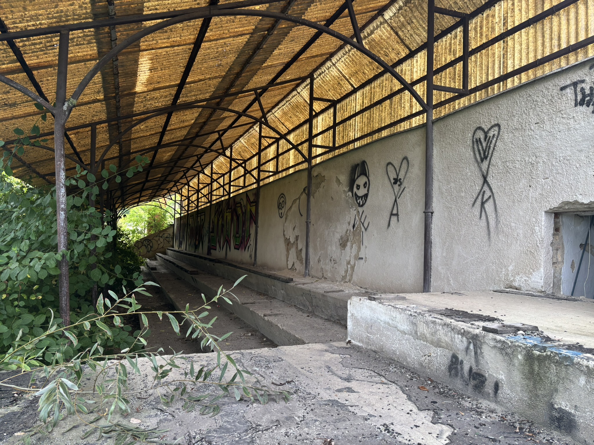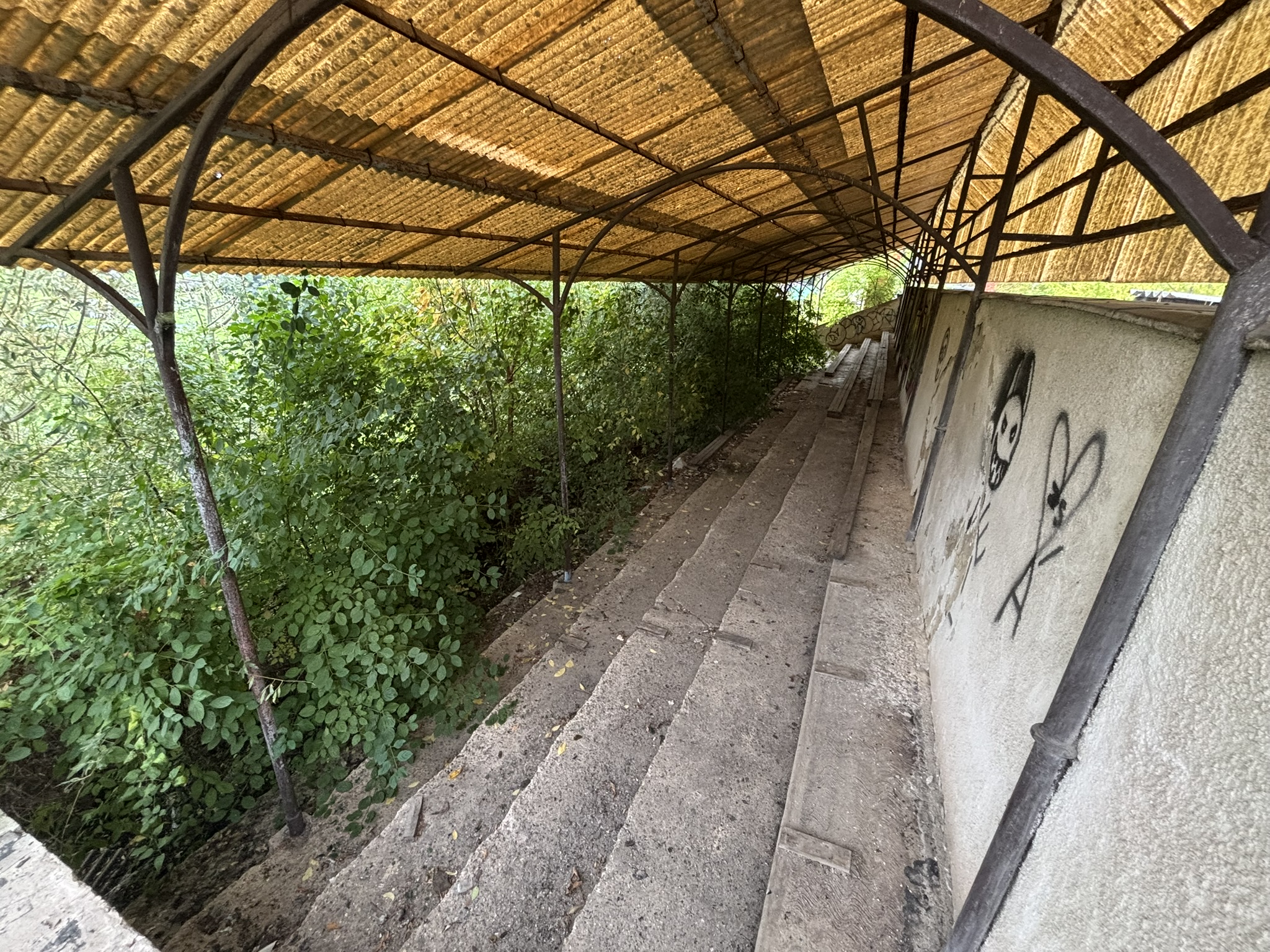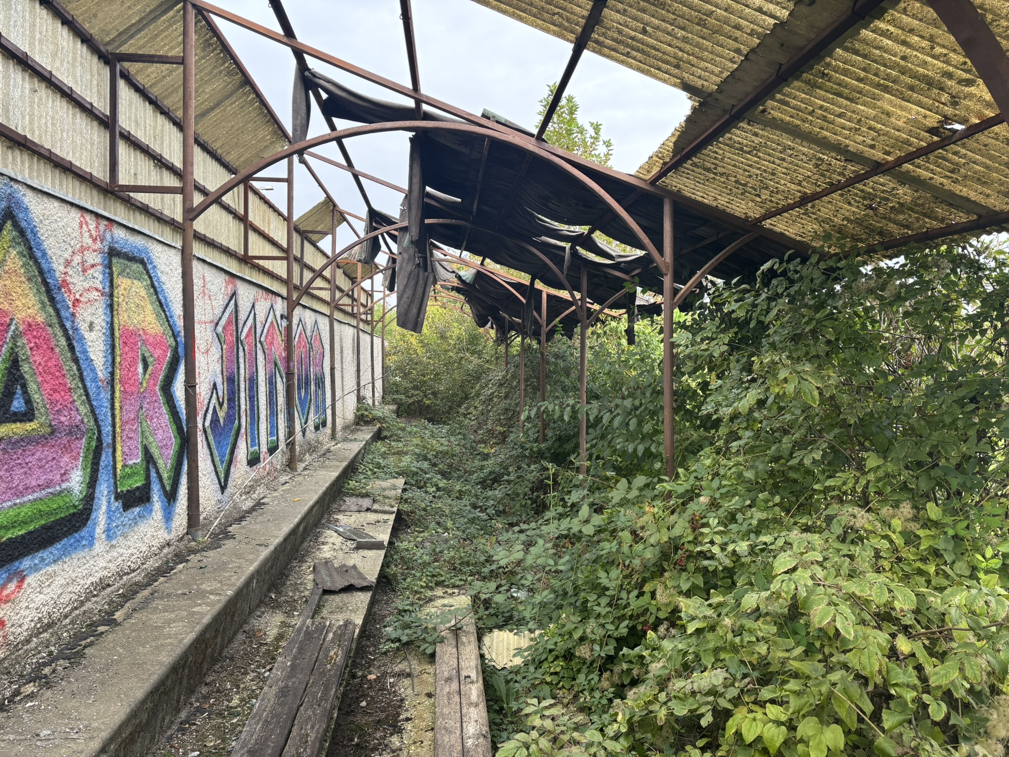 Az egykor szebb napokat látott stadiont benőtte a növényzet, a lelátó szinte ki sem látszik a gazból.