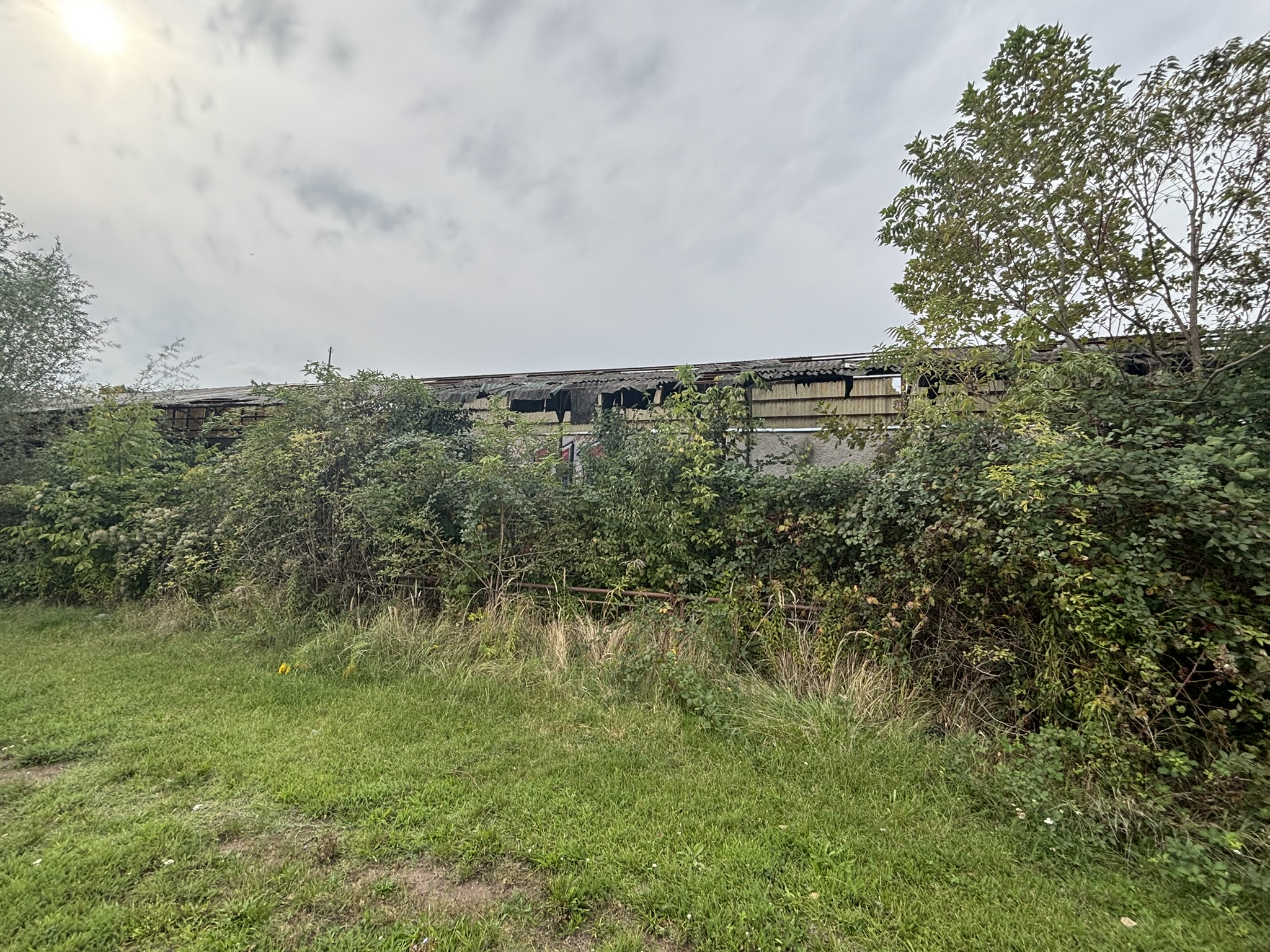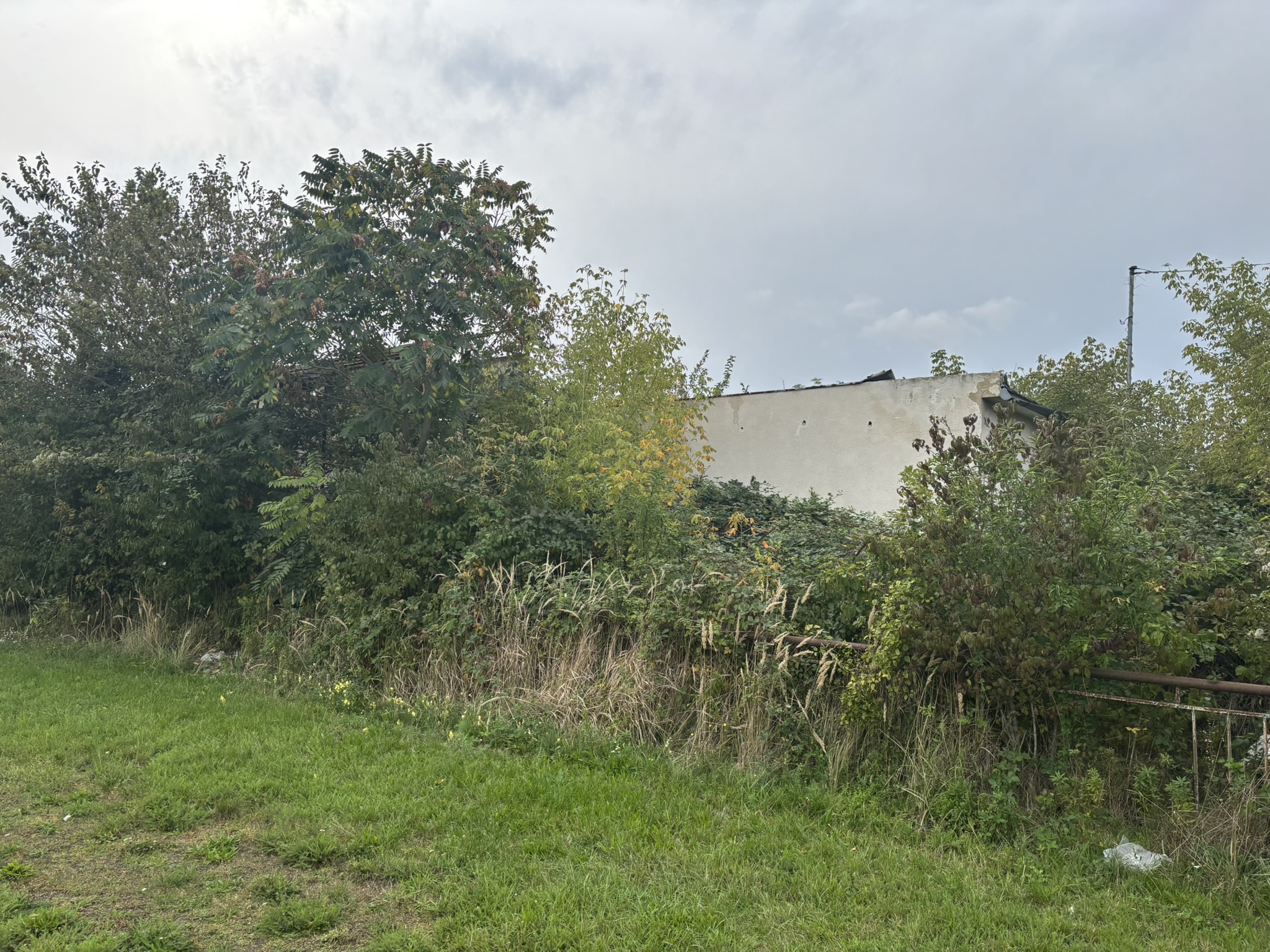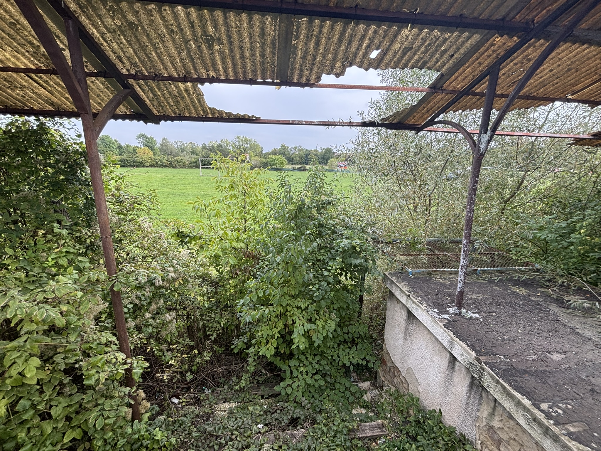 Az egykor szebb napokat látott stadiont benőtte a növényzet, a lelátó szinte ki sem látszik a gazból.