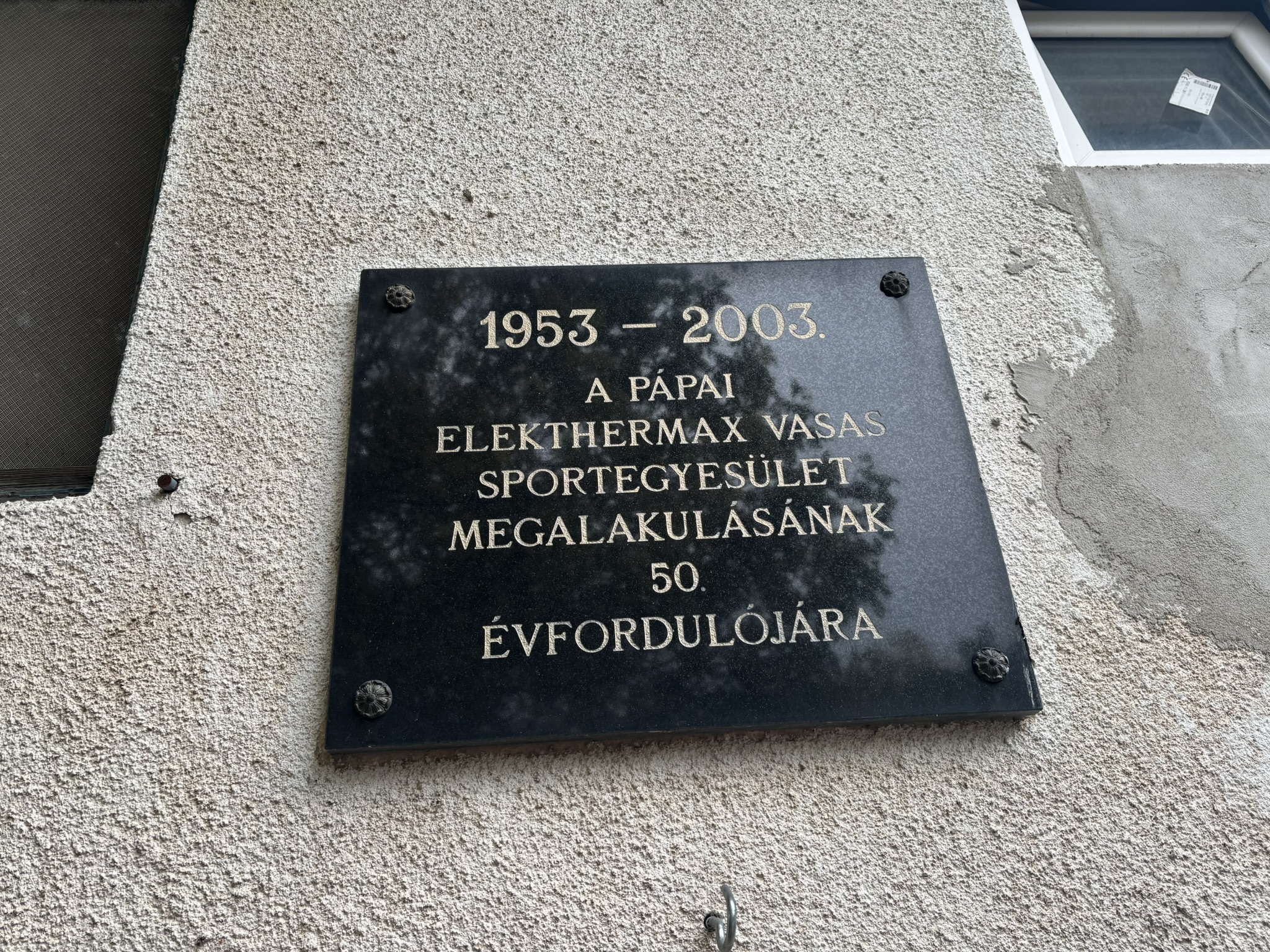 Jubileumi emléktábla a teke pálya épületének falán. A szomszédos tenisz pályákat még használják.