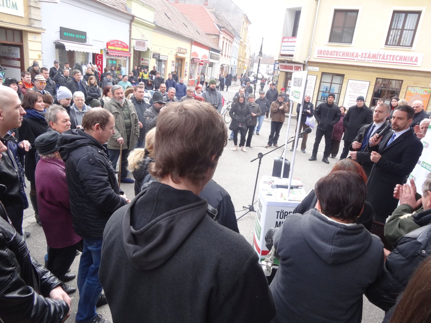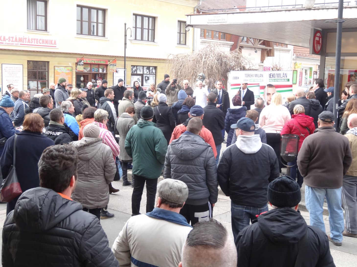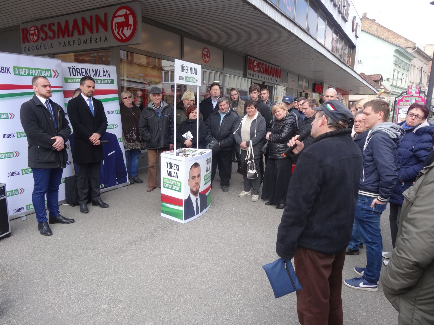 Az áruháznál megtartott fórumon Töreki Milán országgyűlési képviselőjelölt köszöntötte a jelenlévőket és Vona Gábort. – Köszöntöm abban a városban, ahol gimnáziumokban télvíz idején kabátban kell, hogy üldögéljenek a diákok. Abban a városban, melynek híres kórházából mára csak egy siralomház maradt. Abban a városban, amely nem is olyan régen a polgári és szellemi élet egyik pezsgő központja volt, jelenleg egy félelemre és gyűlöletre építő városvezetés ural. Köszöntöm elnök urat abban a városban, amely április 8-án helyt fog állni és el fogja zavarni a narancsos hatalmat – fogalmazott Töreki Milán.