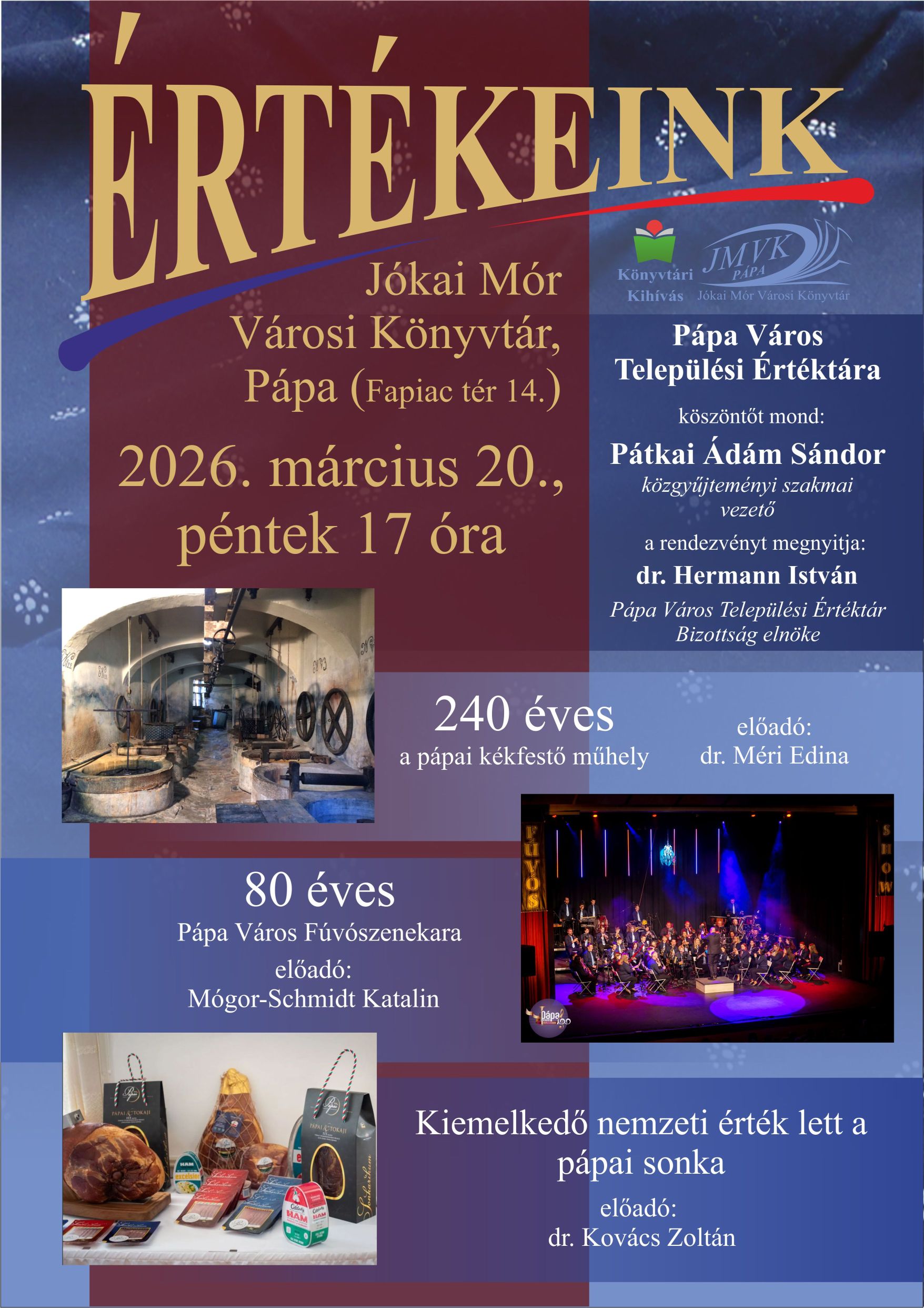 „Értékeink” címmel új rendezvénysorozat indul a Jókai Mór Városi Könyvtárban. Célja a Pápa Város Települési Értéktárába került helyi értékek bemutatása, népszerűsítése, hogy a pápaiak büszkék lehessenek ezekre a kincsekre. Március 20-án, pénteken 17 órakor három előadás várja az érdeklődőket. A 240 éves pápai kékfestő műhelyről dr. Méri Edinától, a 80 éves Pápa Város Fúvószenekaráról Mógor-Schmidt Katalintól és a kiemelkedő nemzeti értékké lett pápai sonkáról az értéktári javaslat benyújtójától, dr. Kovács Zoltántól.