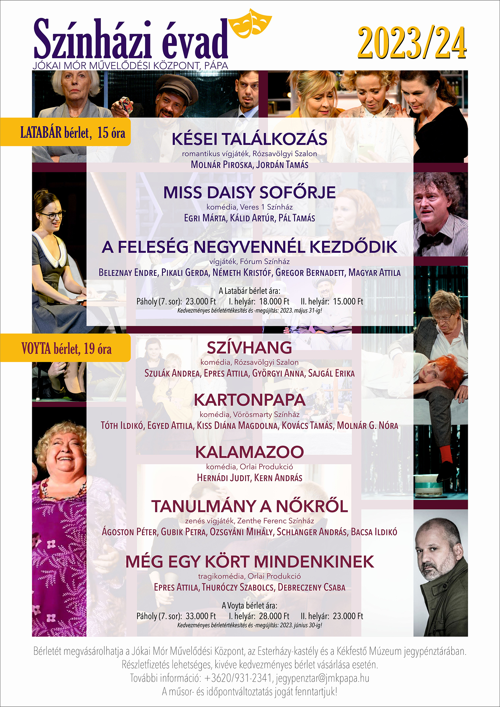 A 2023/24-es színházi évadban többek között olyan színészekkel találkozhat Pápán, mint Hernádi Judit, Kern András, Szulák Andrea, Epres Attila, Thuróczy Szabolcs, Gregor Bernadett, Kálid Artúr, vagy épp Jordán Tamás.