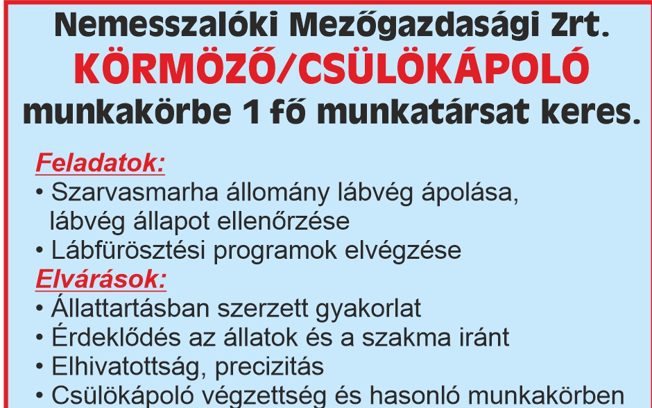 Nemesszalóki Mezőgazdasági Zrt. Körmöző/Csülökápoló munkakörbe 1 fő munkatársat keres.