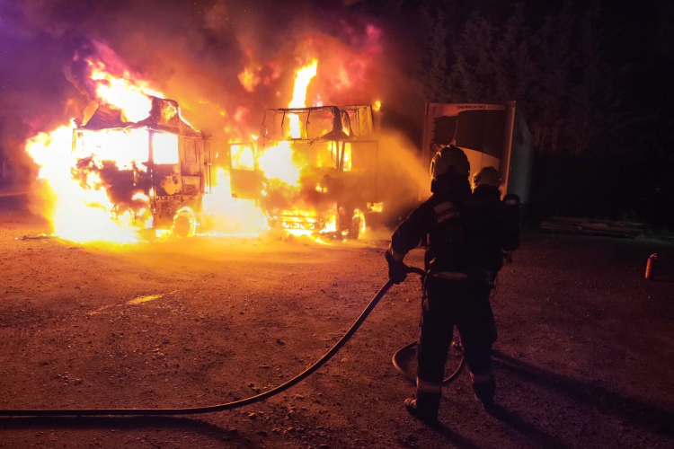 Két kamion kapott lángra hétfőre virradóra Szadán, a Dózsa György úton, egy telephely udvarán.