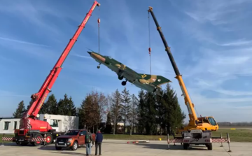 Próbaemelést tartottak ma délután a Bázisrepülőtéren, így a hamarosan a Celli úti körforgalomba kerülő vadászgép egy daru segítségével újra elemelkedhetett a talajtól.
