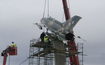 Több nem várt probléma is nehezítette a látványos daruzást, mely végül sikerrel zárult - felkerült a talapzatra a MiG-21-es vadászgép, emléket állítva a pápai katonai repülésnek.
