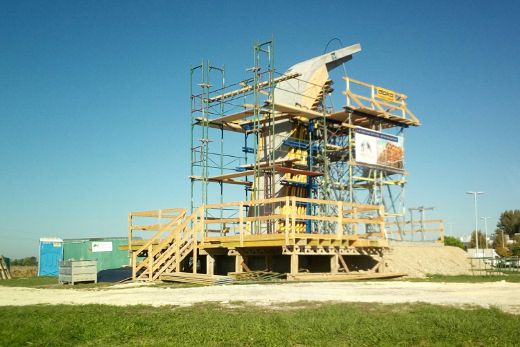 Egy hónappal ezelőtt kezdődött meg a látványos, nagy érdeklődésre számot tartó emlékmű építése. A napokban megérkezett az íves beton tartószerkezet zsaluzatának első része, ennek összeépítése zajlik jelenleg is.