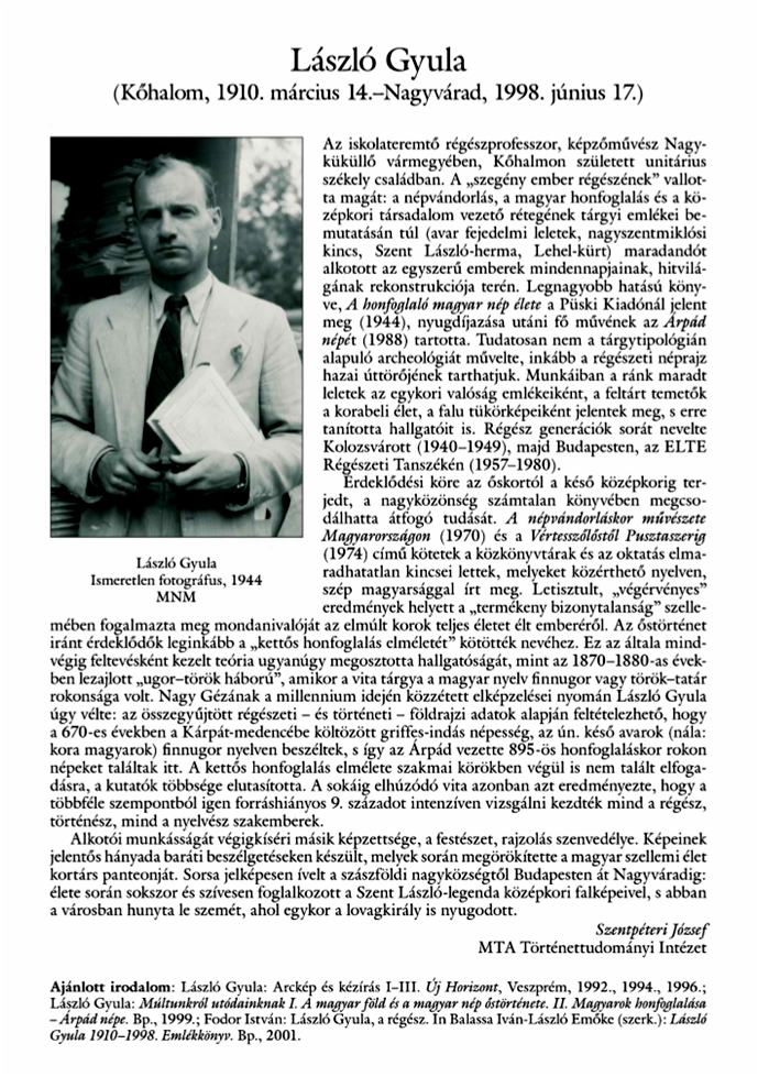 Sajnos, László Gyula huszonkét esztendeje nincsen az élők sorában, amikor meghalt nyolcvannyolc éves volt. Az idei, 2020-as március idusán volt születésének száztizedik évfordulója. A 2010-es „Nemzeti évfordulóink” című kiadványból most Szentpéteri József régész életrajzi összefoglalója segítségével szeretném fölvillantani tartalmas életútjának-munkásságának fontosabb momentumait: