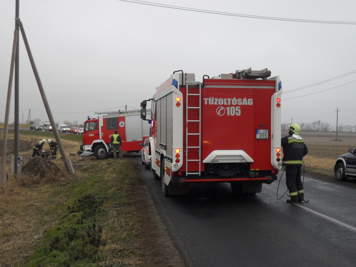 Felborult egy személyautó Veszprém megyében, Nyárád és Nemesszalók között. A roncsba beszorult egy ember, akit a műszaki mentéshez riasztott pápai hivatásos tűzoltók szabadítottak ki, ő és a jármű másik utasa is súlyosan megsérült a balesetben. A tűzoltók a közútkezelő szakembereit is a helyszínre kérték a rendkívül csúszós útfelület síkosságmentesítésére. A helyszínelés idejére teljes szélességében lezárták az utat.