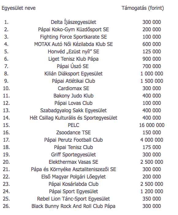 Támogatott egyesületek listája: (A listán 35 millió forint támogatási összeg szerepel, mivel egyes sportegyesületek csak az első félévi támogatást kapták meg, a második félévben további 10 millió forintot osztanak szét.)