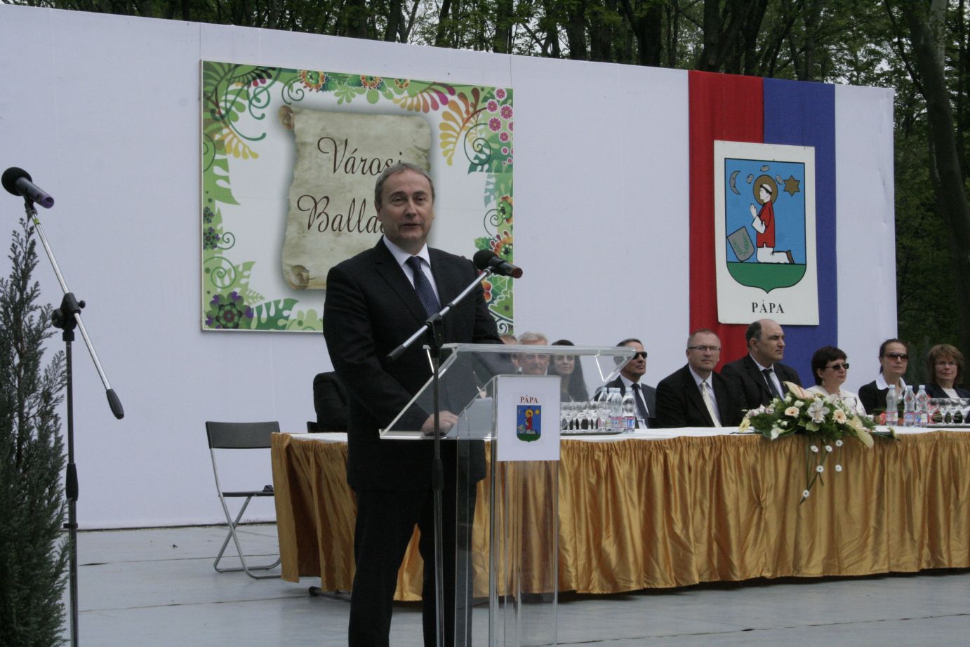 Az ünnepi szónoklatot idén Kovács Zoltán államtitkár, országgyűlési képviselő mondta. A város volt polgármestere Ákos: Ilyenek voltunk című dalának ismert soraival köszöntötte az ifjúságot. Kovács Zoltán a ballagást és a közelgő érettségit a felnőtté válás rituáléjának nevezte, mely határvonalat jelent az életünkben. Egy korszak végét és egy új kezdetét. - A felnőtt kor nagyobb szabadságot, de egyben nagyobb felelősséget is jelent. Megnyílik az önálló döntés lehetősége, de minden döntésnek következménye van. Bármerre is visz az utatok, Pápa igazodási pont kell, hogy maradjon, kötődés a szülőföldhöz, a városhoz. Teljesen természetes, hogy fiatalon mindenkit hajt a kalandvágy, a tapasztalatszerzés, a jobb anyagi lehetőségek. De higyjétek el, mégis ott marad bennetek az otthon melege, kötődés szűkebb pátriánkhoz, kötődés a hazához - szólt a ballagókhoz az államtitkár sok sikert kívánva nekik a közelgő vizsgákhoz, és hosszabb távú terveik, álmaik megvalósításához.