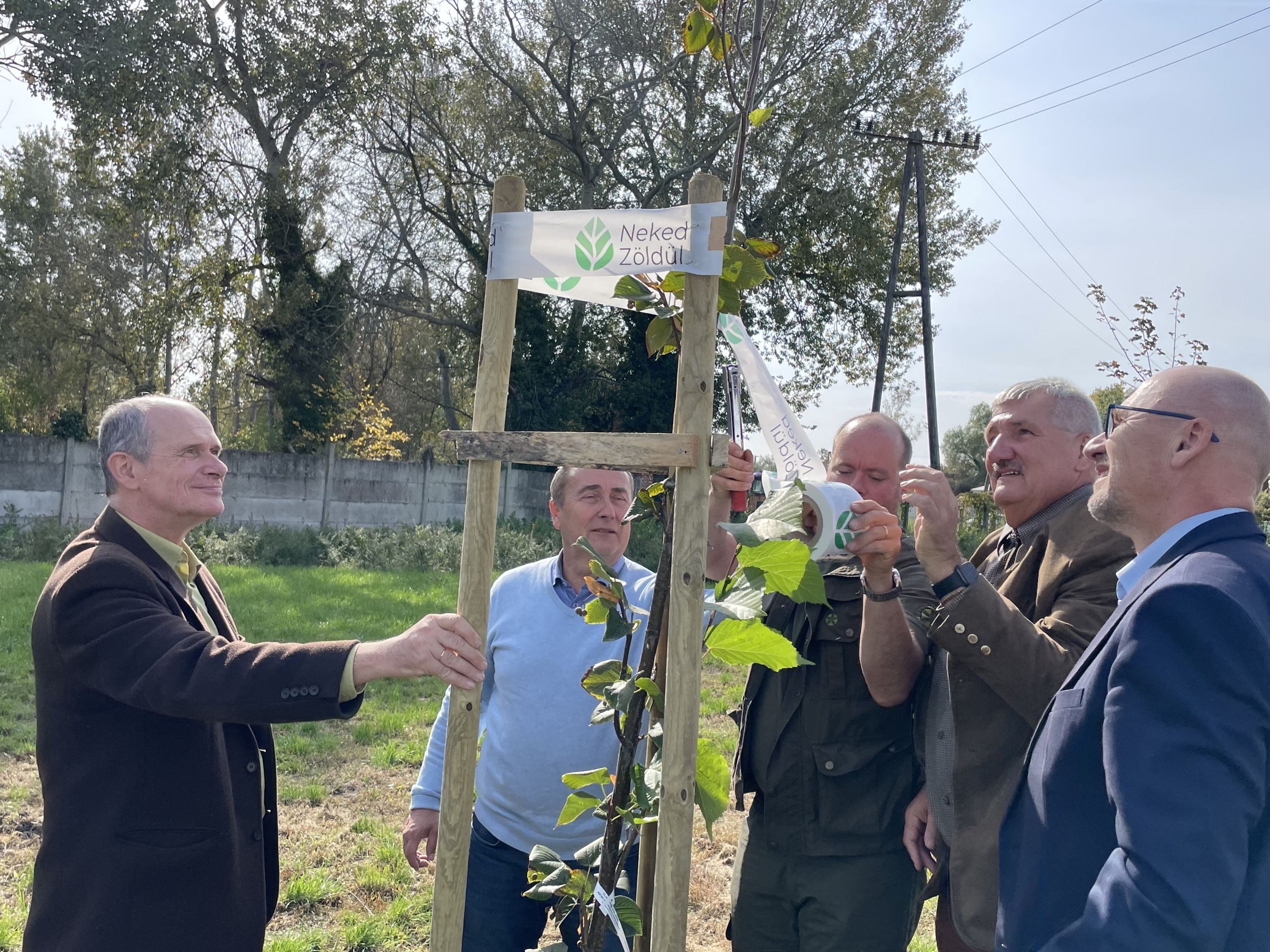 Az első növényt a Schwenczel réten ültette dr. Kovács Zoltán országgyűlési képviselő, dr. Áldozó Tamás polgármester, Venczel Csaba, a térség önkormányzati képviselője, Varga László a Bakonyerdő Zrt. vezérigazgatója, valamint a Batthyány Iskola egyik diákja.