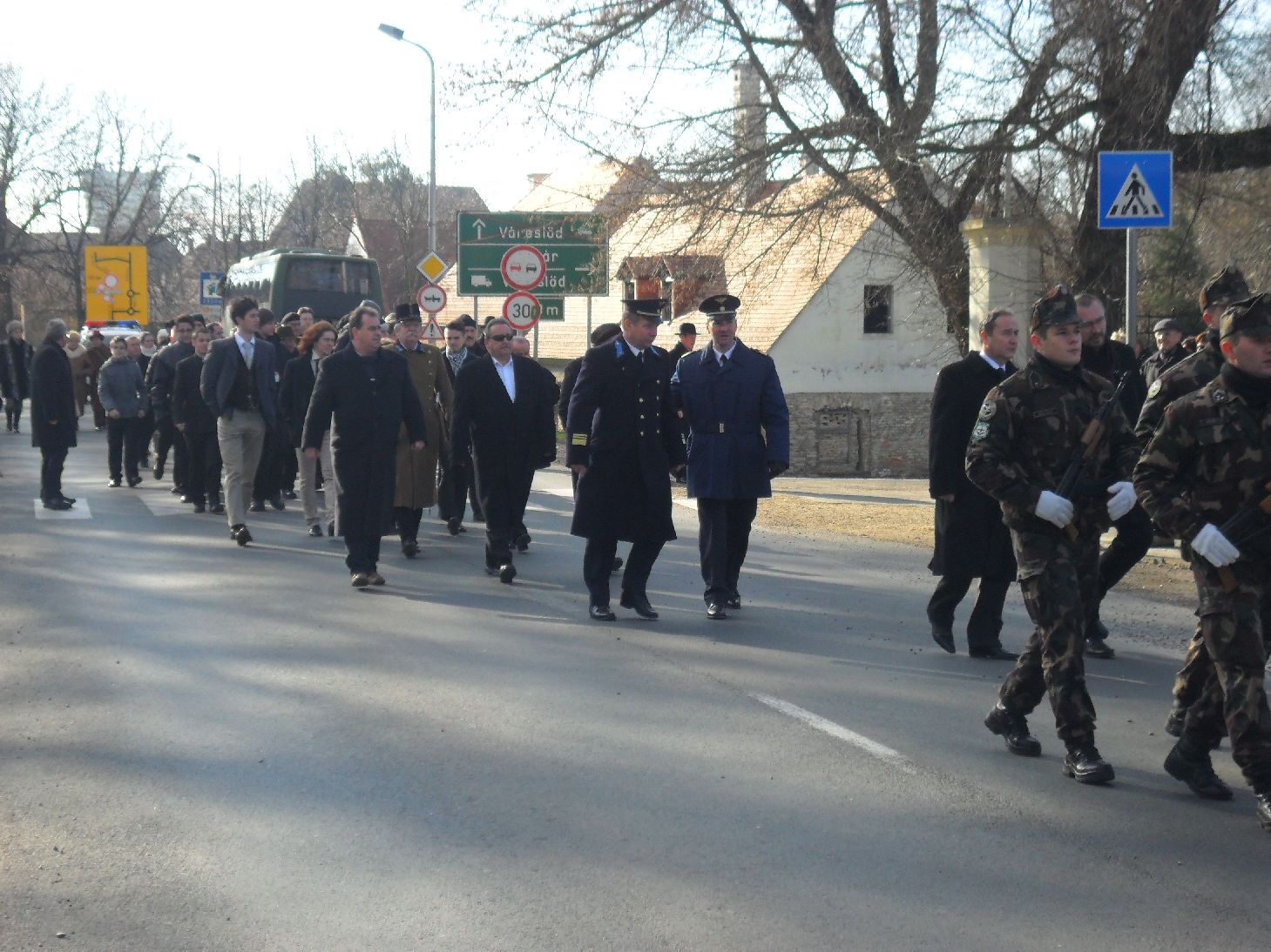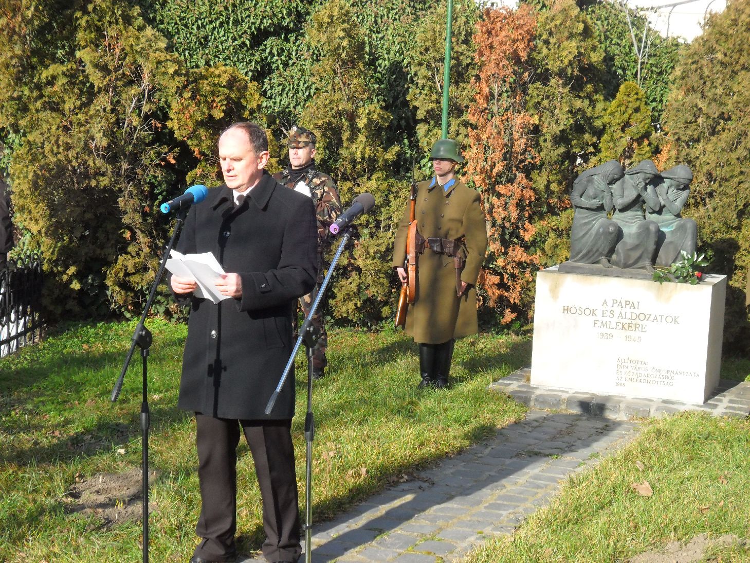 Az istentiszteletet követően az emlékezők együtt vonultak át az Esterházy-út sarkán lévő II. világháborús emlékműhöz. A Himnusz hangjai után Kincses László szavalt. Emlékező beszédet mondott Bolla Kálmán. A Pápai Huszáregyesület elnöke felidézte a 71 évvel ezelőtti eseményeket. - 1943. január 12-e reggelén még nem sejtette a Don folyó védelmét ellátó magyar királyi II. honvéd hadsereg közel 200.000 katonája, hogy hamarosan a magyar történelem egyik legnagyobb katasztrófája, a magyar hadtörténet legnagyobb veresége következik be, és ennek részesévé válik.